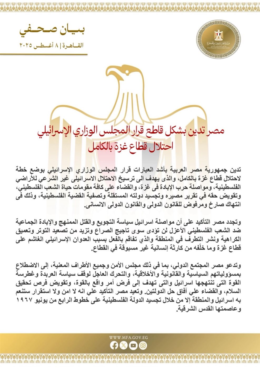 أدانت مصر بأشد العبارات قرار المجلس الوزاري الإسرائيلي بوضع خطة لاحتلال قطاع غزة بالكامل، والذي يهدف إلى ترسيخ الاحتلال الإسرائيلي غير الشرعي للأراضي الفلسطينية، ومواصلة حرب الإبادة فى غزة، والقضاء على كافة مقومات حياة الشعب الفلسطيني، وتقويض حقه في تقرير مصيره وتجسيد دولته المستقلة وتصفية القضية الفلسطينية، وذلك في انتهاك صارخ ومرفوض للقانون الدولي والقانون الدولي الإنساني.