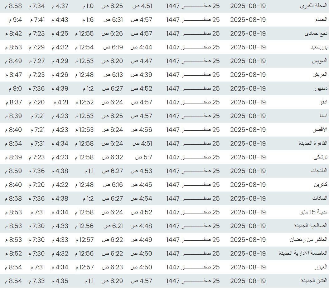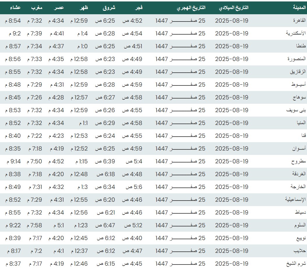 مواقيت الصلاة اليوم الثلاثاء 19 – 8 - 2025 في القاهرة والمحافظات