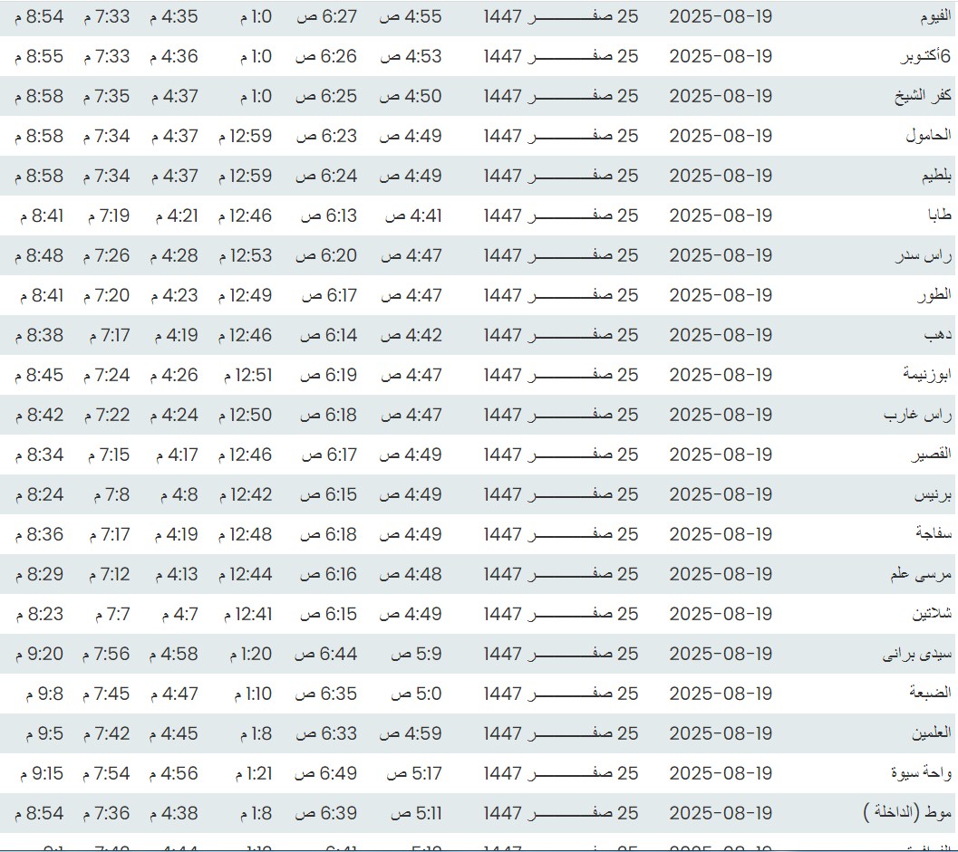 مواقيت الصلاة اليوم وفقًا للتوقيت المحلي لمدينتي القاهرة والإسكندرية وكذلك لعدد من مدن ومحافظات الجمهورية من واقع بيانات الهيئة العامة للمساحة: