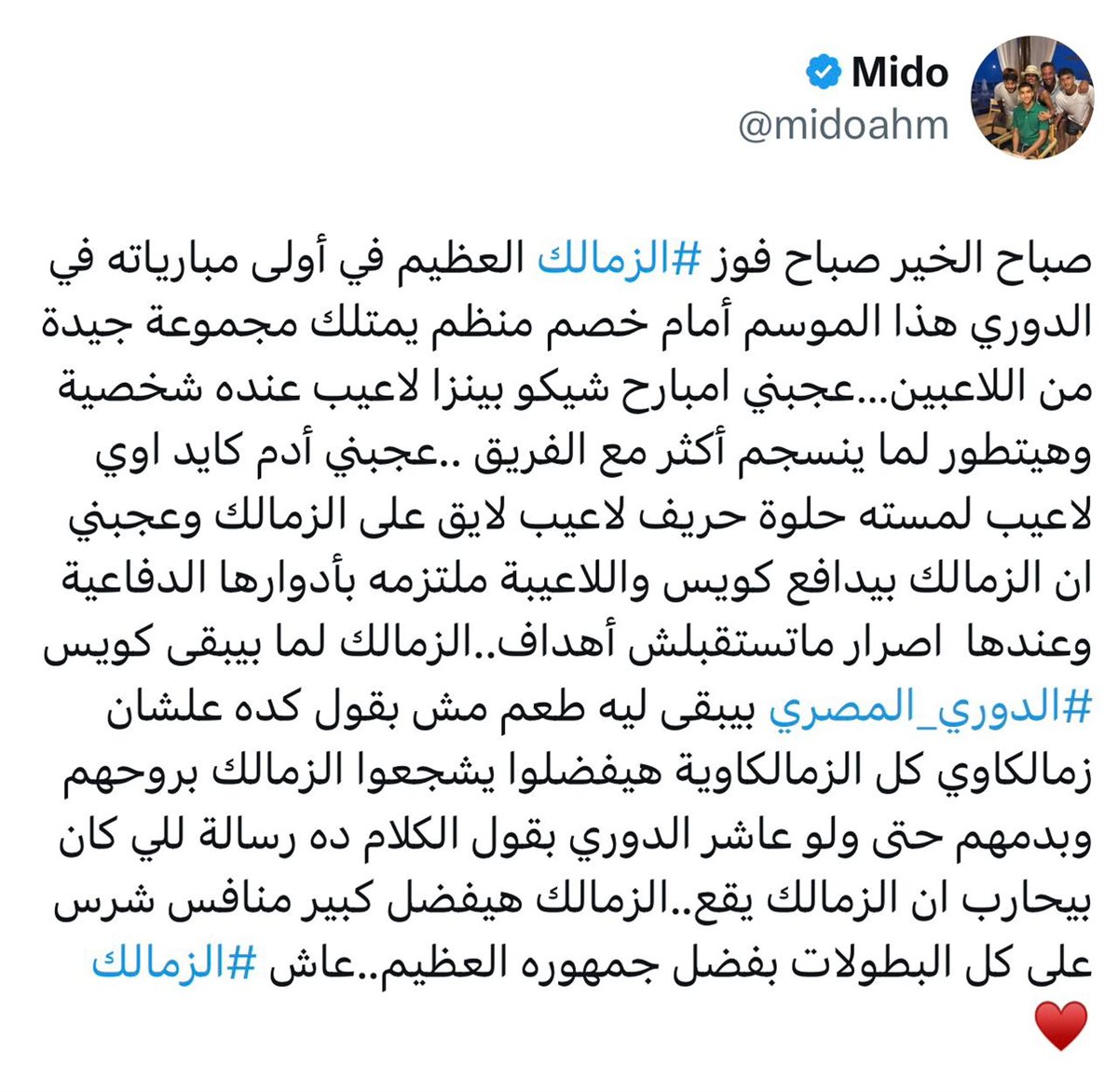 وكتب ميدو عبر حسابه الرسمي على منصة “X” صباح اليوم: “صباح الخير، صباح فوز الزمالك العظيم أمام خصم منظم يمتلك مجموعة جيدة من اللاعبين”.