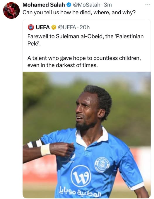 وحرص النجم المصري محمد صلاح علي التعليق علي تلك الواقعة المأساوية، حيث نشر لاعب ليفربول تغريدة عبر حسابه الرسمي علي إكس عن استشهاد لاعب منتخب فلسطين وعلق علي بسؤال وكتب، "هل يمكنك أن تخبرنا كيف توفي وأين ولماذا؟.