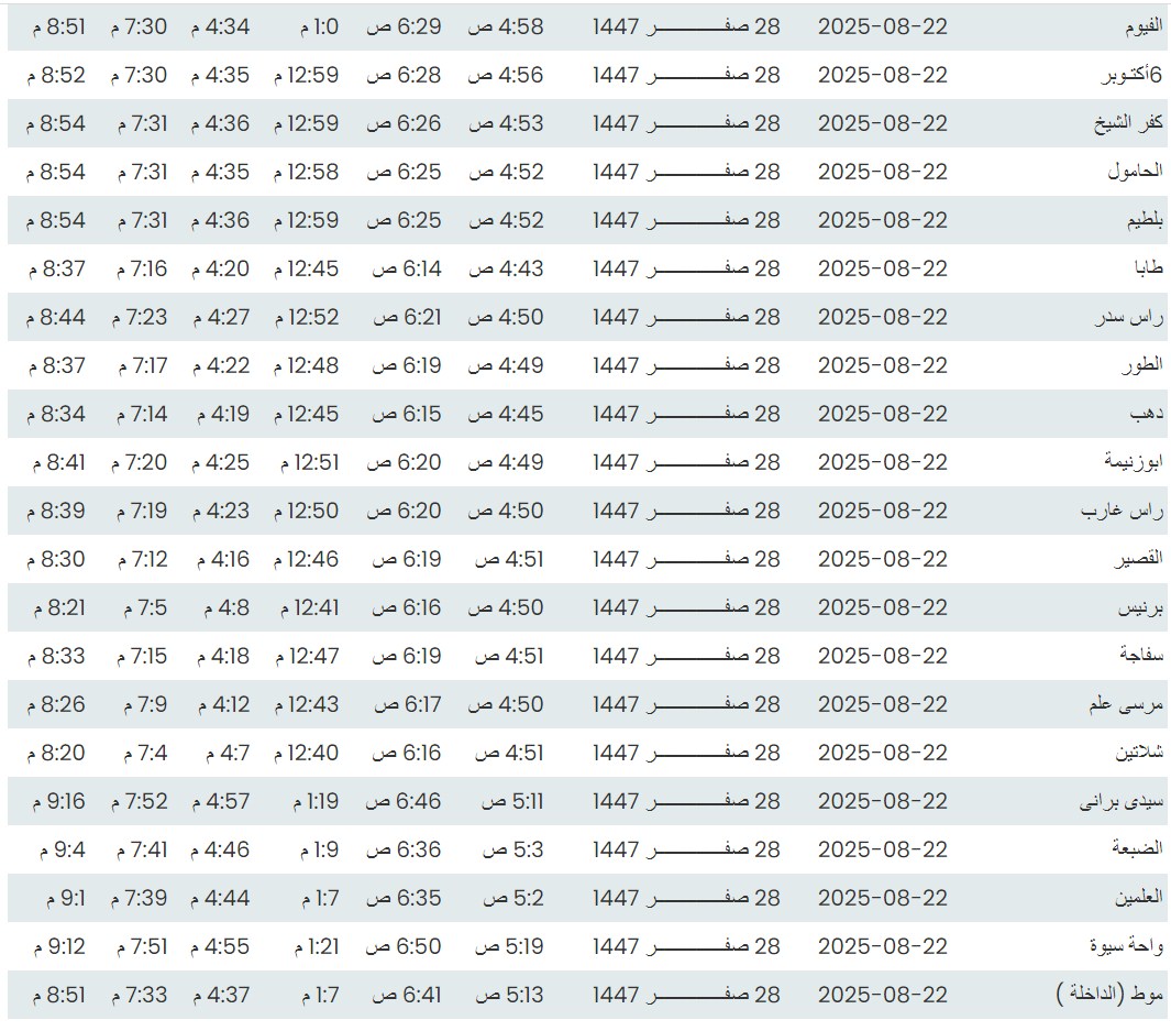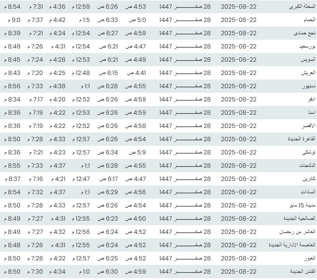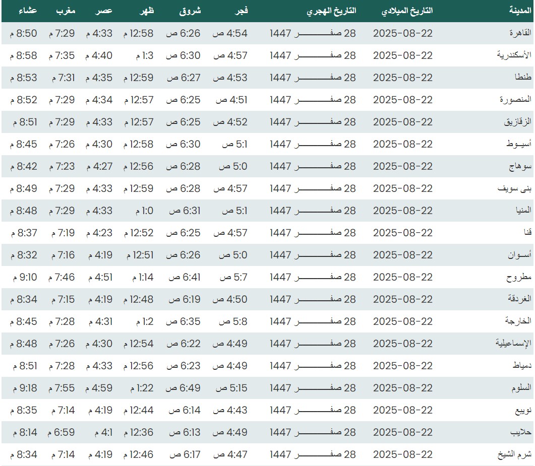 مواقيت الصلاة اليوم وفقًا للتوقيت المحلي لمدينتي القاهرة والإسكندرية وكذلك لعدد من مدن ومحافظات الجمهورية من واقع بيانات الهيئة العامة للمساحة: