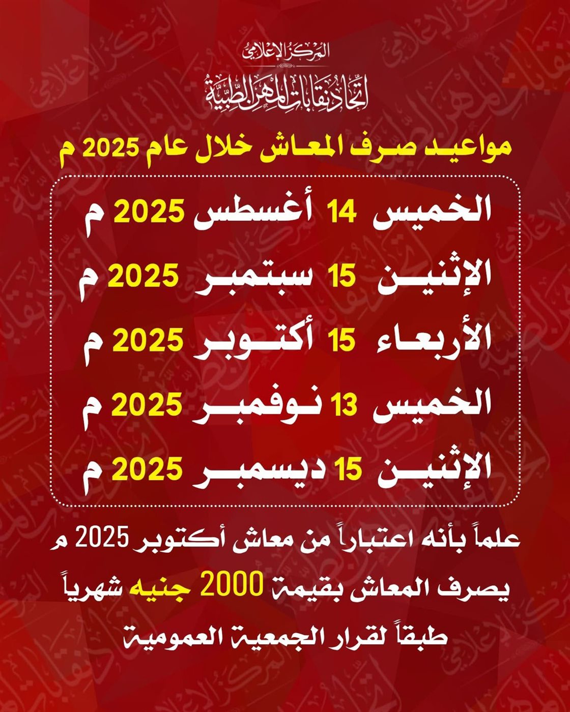 أعلنت الأمانة العامة لاتحاد نقابات المهن الطبية والذي يضم النقابات الأربع؛ (الأطباء البشريين وأطباء الأسنان والصيادلة والأطباء البيطريين) مواعيد صرف المعاش للأعضاء وأسرهم عن الأشهر المتبقية من عام 2025، حيث يتم الصرف في: الخميس 14 أغسطس، الإثنين 15 سبتمبر، الأربعاء 15 أكتوبر، الخميس 13 نوفمبر، والإثنين 15 ديسمبر.