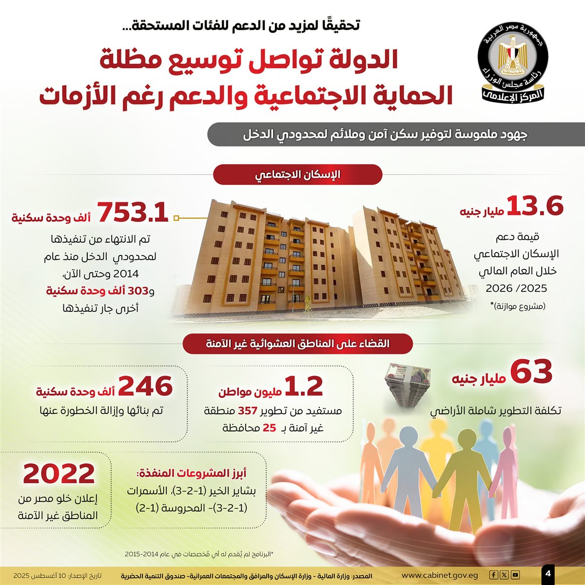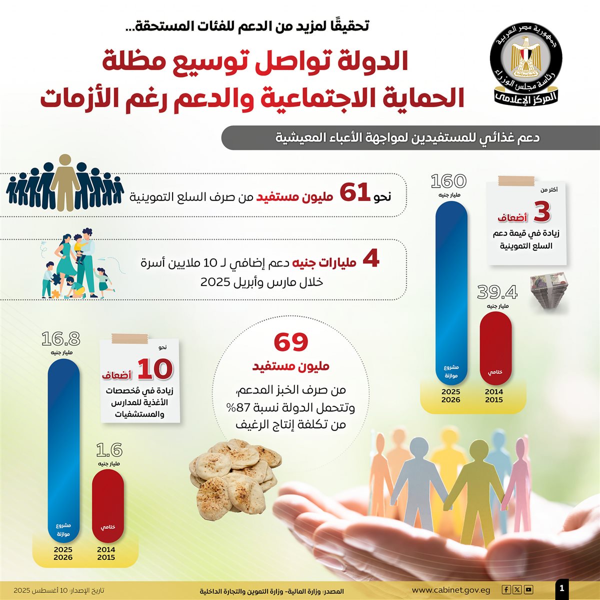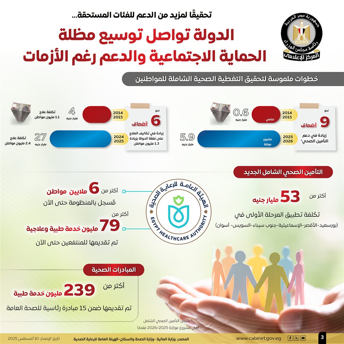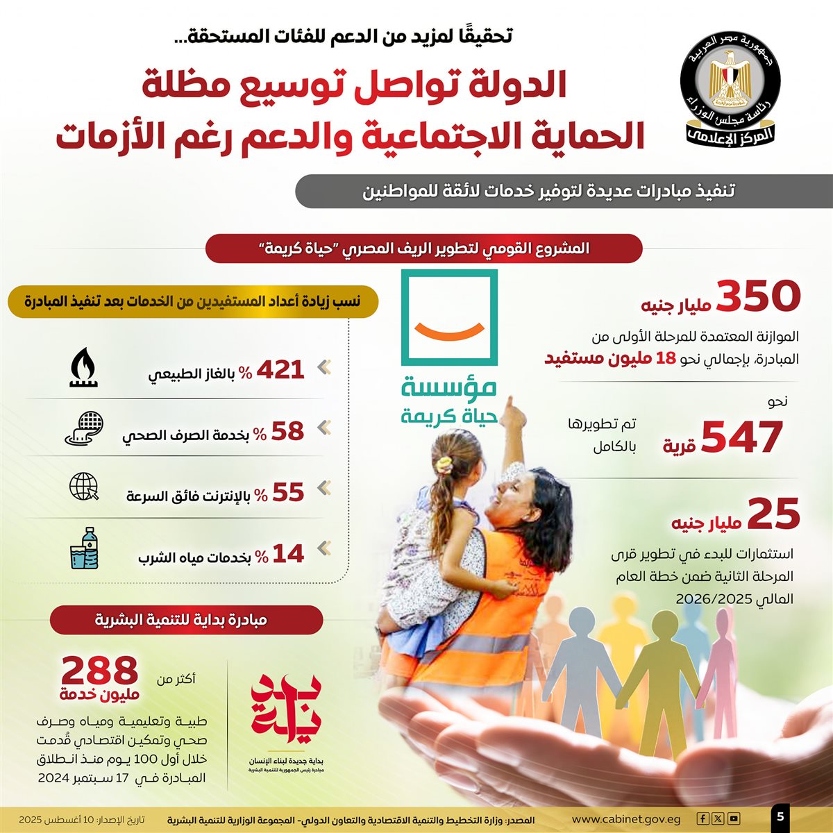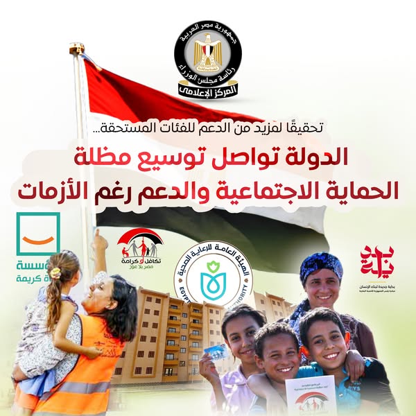 نشر المركز الإعلامي لمجلس الوزراء عددًا من الإنفوجرافات عبر منصاته على مواقع التواصل الاجتماعي، استعرض من خلالها جهود الدولة المتواصلة لتوسيع مظلة الحماية الاجتماعية والدعم للفئات المستحقة.