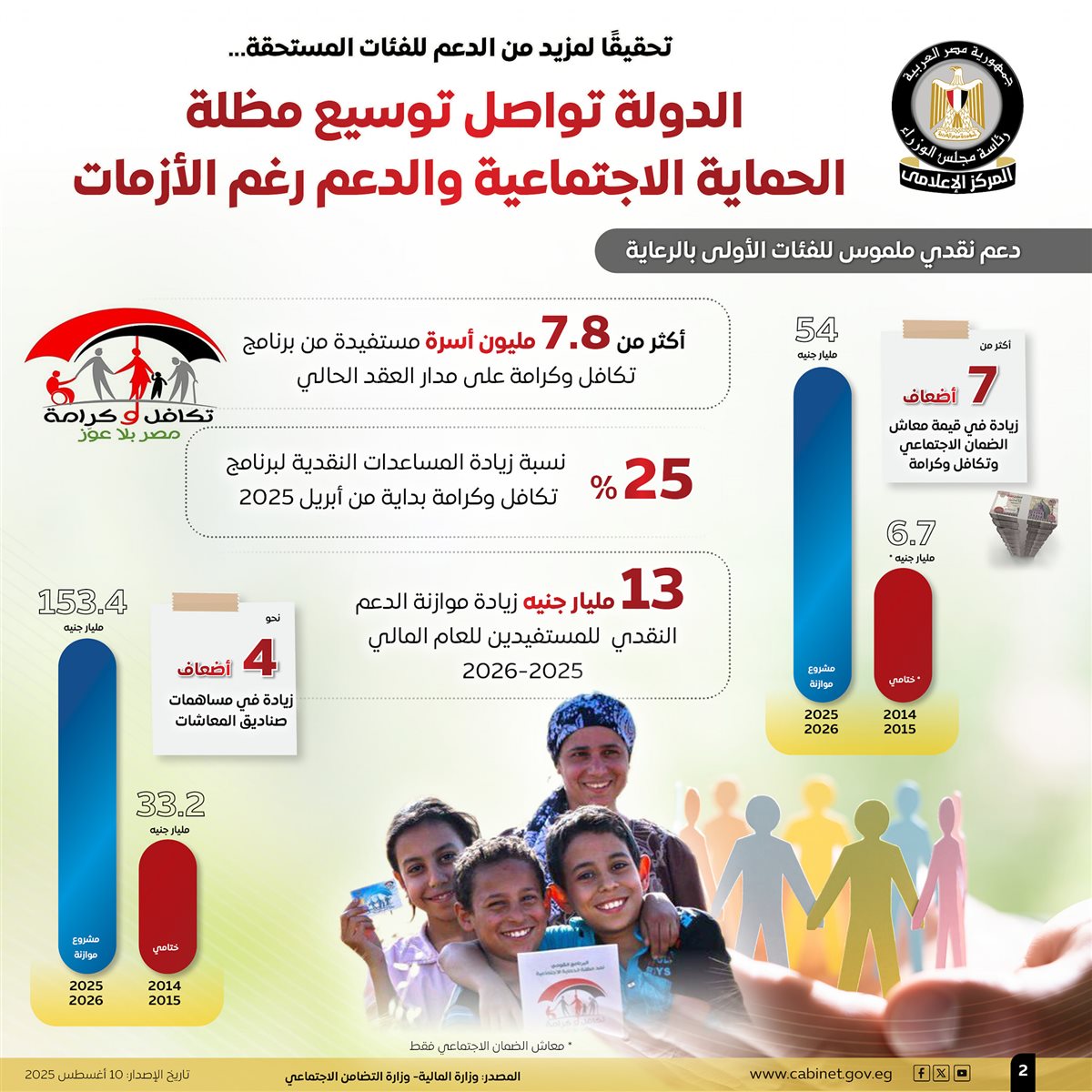 وعلى صعيد الدعم النقدي الملموس للفئات الأولى بالرعاية، أظهرت الإنفوجرافات، زيادة قيمة معاش الضمان الاجتماعي وتكافل وكرامة لأكثر من 7 أضعاف، لتصل إلى 54 مليار جنيه عام 2025/2026 (مشروع موازنة)، مقابل 6.7 مليار جنيه عام 2014/2015 (ختامي) "معاش الضمان الاجتماعي فقط".