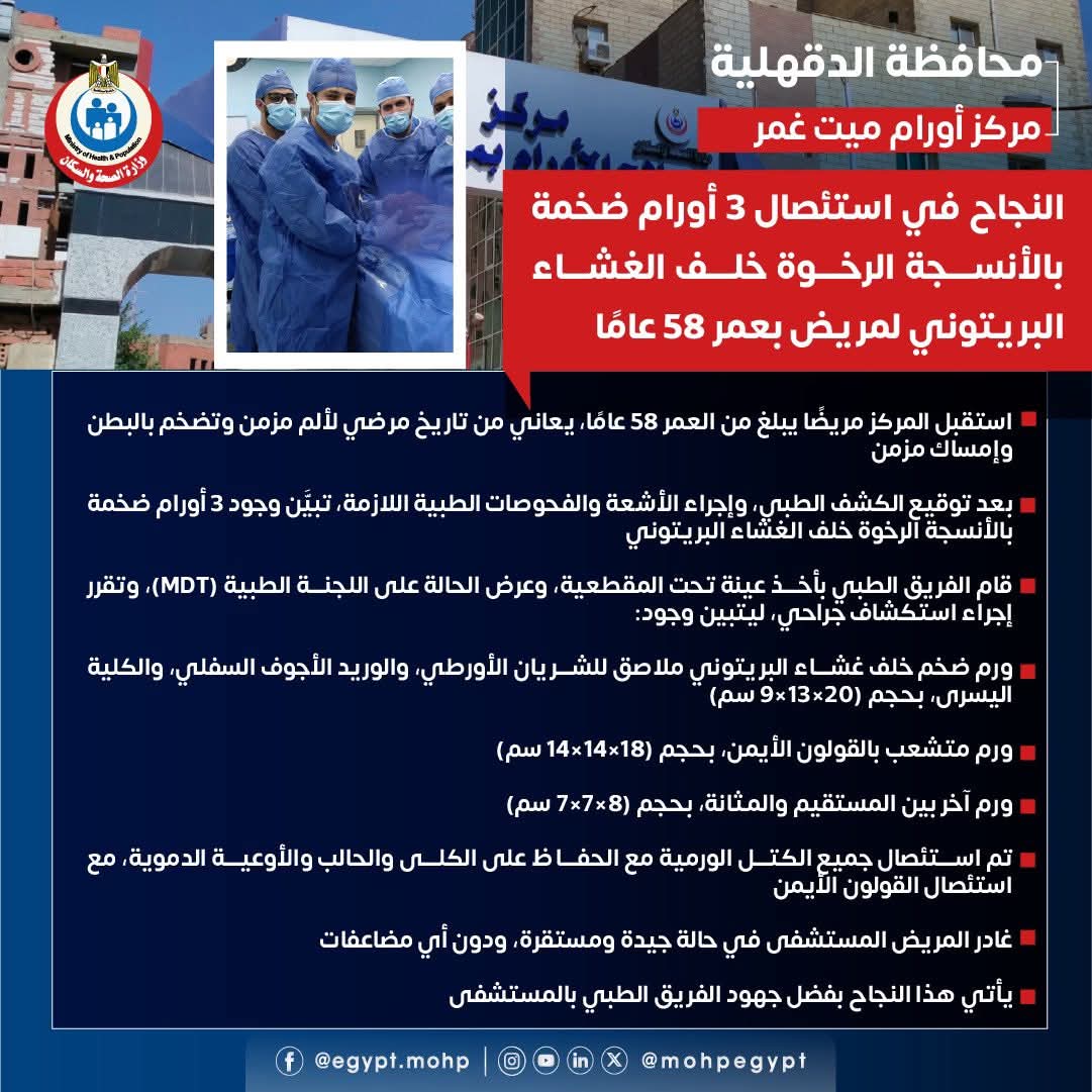 اعلنت وزارة الصحة عن نجاح فريق مركز أورام ميت غمر بمحافظة الدقهلية في استئصال ثلاثة أورام ضخمة بالأنسجة الرخوة خلف الغشاء البريتوني لمريض يبلغ من العمر 58 عامًا، وذلك تحت إشراف وزارة الصحة والسكان.