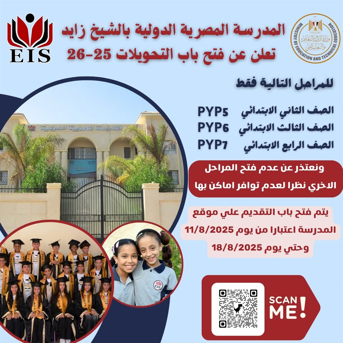 أعلنت المدرسة المصرية الدولية بالشيخ زايد، فتح باب التحويلات أمام الطلاب للعام الدراسي 2026/2025، لعدد من المراحل التعليمية، اليوم الإثنين.