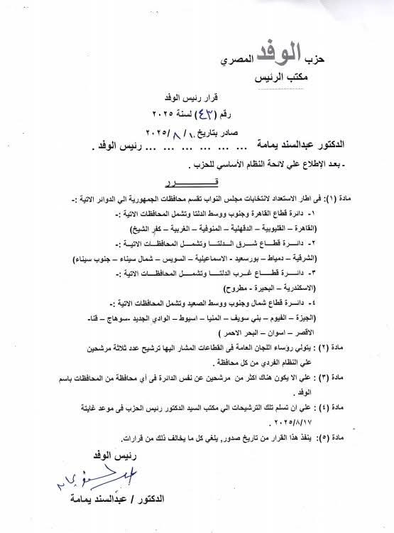 أصدر الدكتور عبدالسند يمامة رئيس حزب الوفد قرارا تنظيميا بشأن استعدادات الحزب لانتخابات مجلس النواب المقبلة، والذى يشمل تقسيم محافظات الجمهورية إلى دوائر وقطاعات.