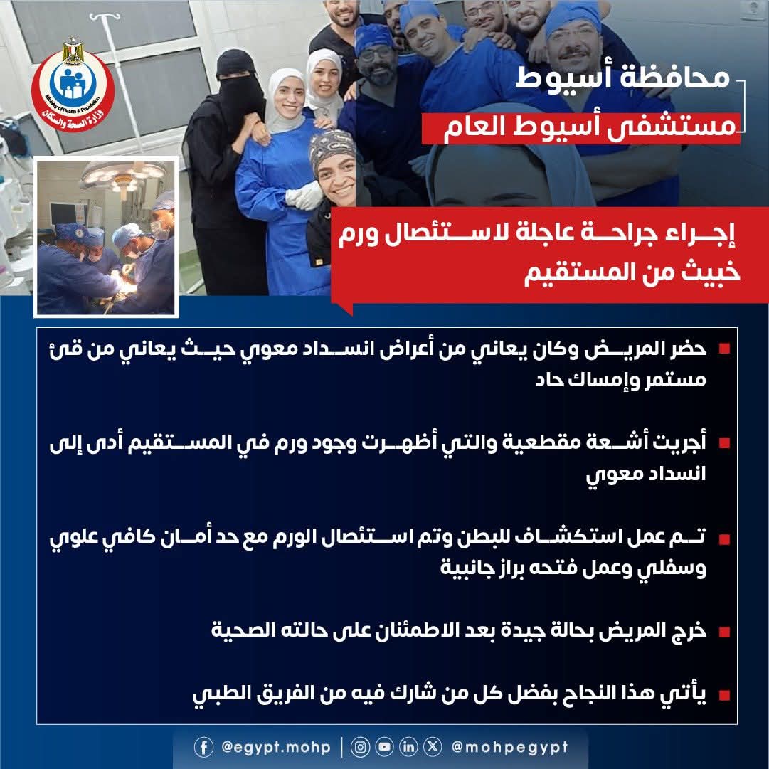 أعلن مستشفى أسيوط العام، التابع لوزارة الصحة والسكان، عن نجاح فريقه الطبي في إجراء جراحة عاجلة لاستئصال ورم خبيث من المستقيم لمريض كان يعاني من أعراض انسداد معوي حاد، شملت قيئا مستمرًا وإمساكا شديدا.