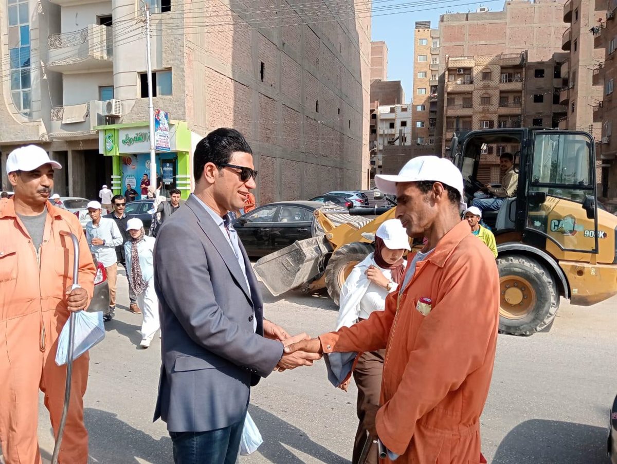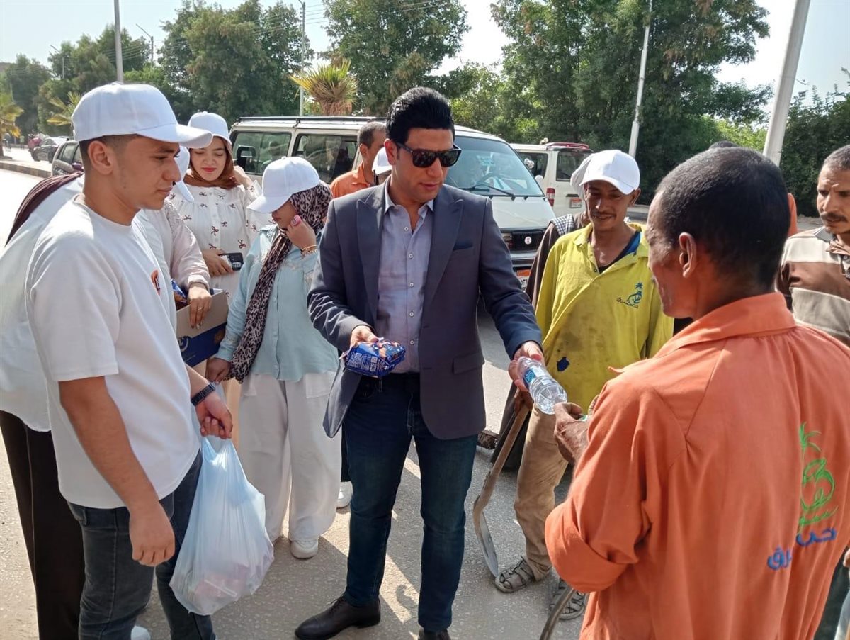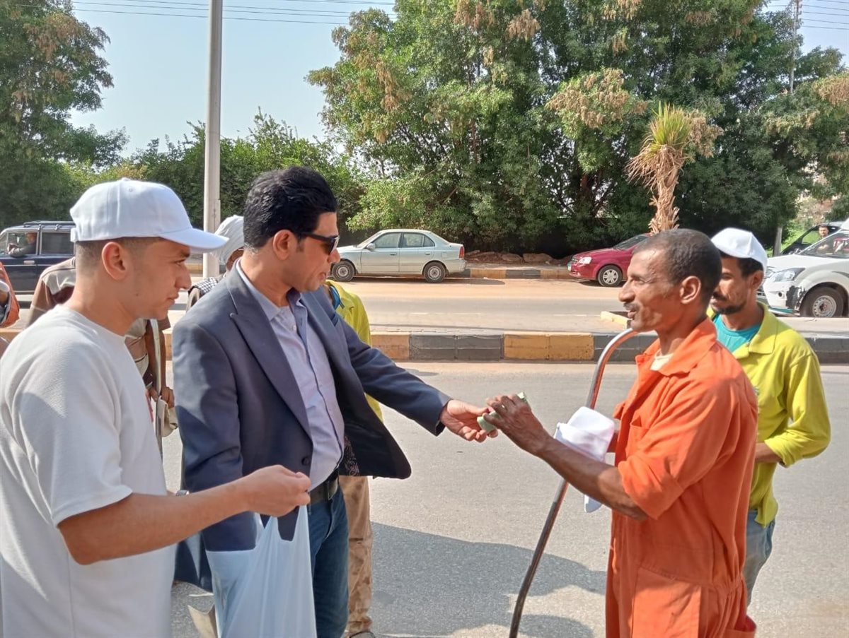نائب محافظ سوهاج يوزع مواد غذائية وزجاجات مياه وأغطية رأس على عمال النظافة