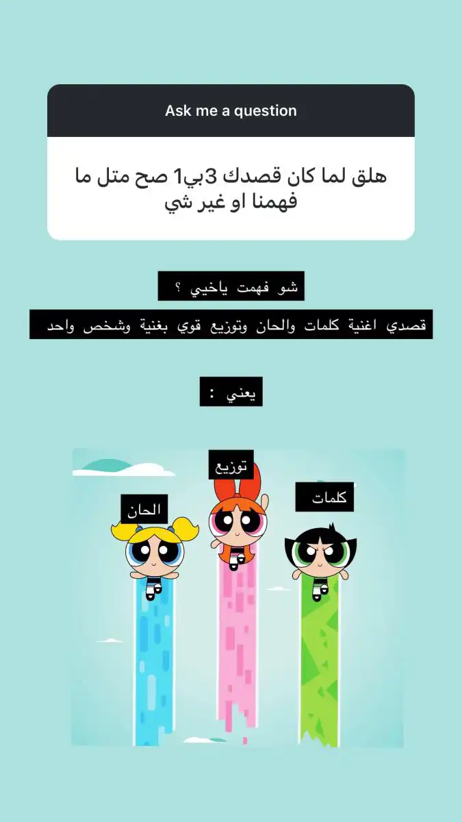 ردًّا على استفسار من أحد المتابعين حول ما إذا كانت صورة النسكافيه تقصد التريو بشكل مباشر، أجاب الشامي: شو فهمت يا خيي؟ قصدي أغنية كلمات وألحان وتوزيع في شخص واحد، يعني كلمات، توزيع، ألحان.