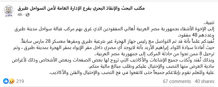 وقال المكتب في بيانه: "إلى الإخوة الأشقاء بجمهورية مصر العربية أهالي المفقودين الذي غرق بهم مركب قبالة سواحل مدينة طبرق وعددهم 48 مفقودًا".