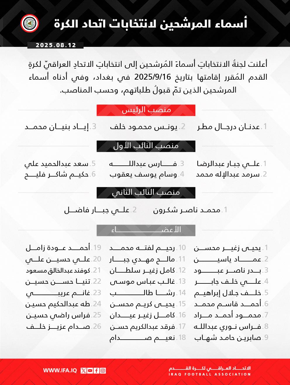 أعلنت لجنة الانتخابات أسماء المُرشحين في انتخابات الاتحاد العراقي لكرة القدم المقرر إقامتها بتاريخ 2025/9/16 في بغداد.
