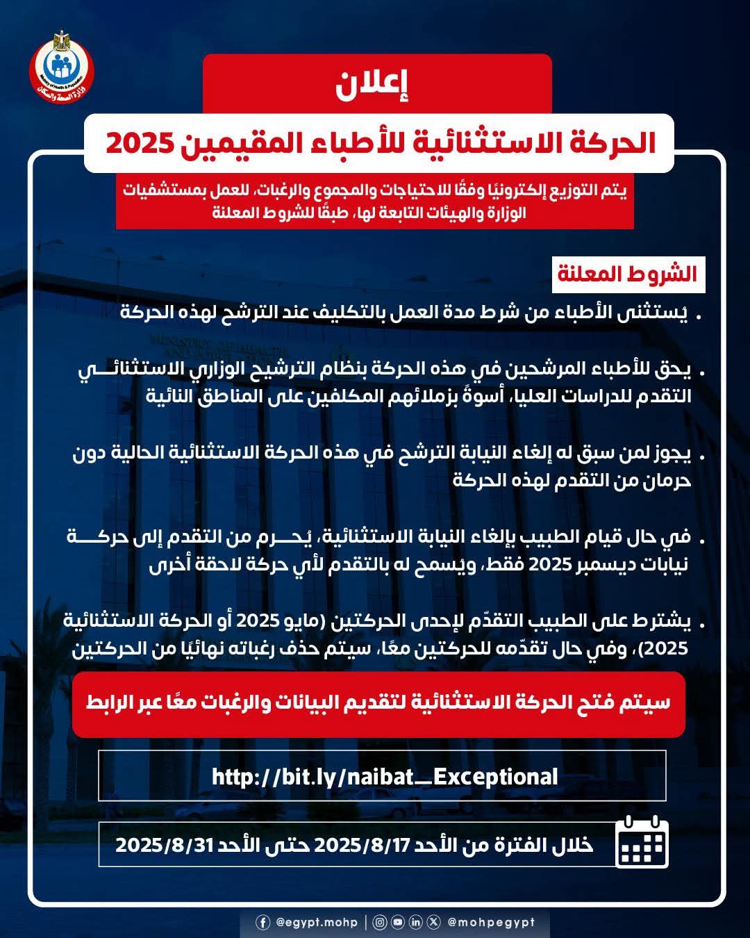 يشترط على الطبيب التقدم لإحدى الحركتين فقط مايو 2025 أو الحركة الاستثنائية 2025، وفي حال التقديم للحركتين معًا، سيتم حذف الرغبات نهائيا من كلتيهما.