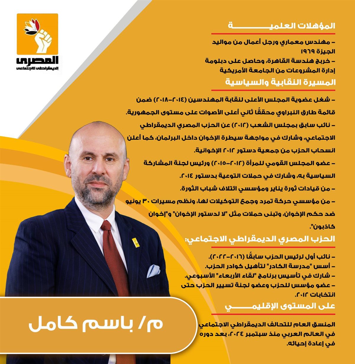 وأعلن المصري الديمقراطي فوز المرشحون الخمسة وهم باسم كامل، برلماني سابق، الأمين العام للحزب، وأميرة صابر قنديل، نائب رئيس الحزب، عضو مجلس النواب 2020 / 2025، والمستشار خالد راشد، نائب رئيس الحزب، ومحمد طه عليوة، محام بالنقض، عضو مجلس الأمناء وعضو مجلس الشيوخ عن الحزب 2020 /2025 وأحمد عبداللاه، طبيب أسنان، عضو المكتب السياسي للحزب.