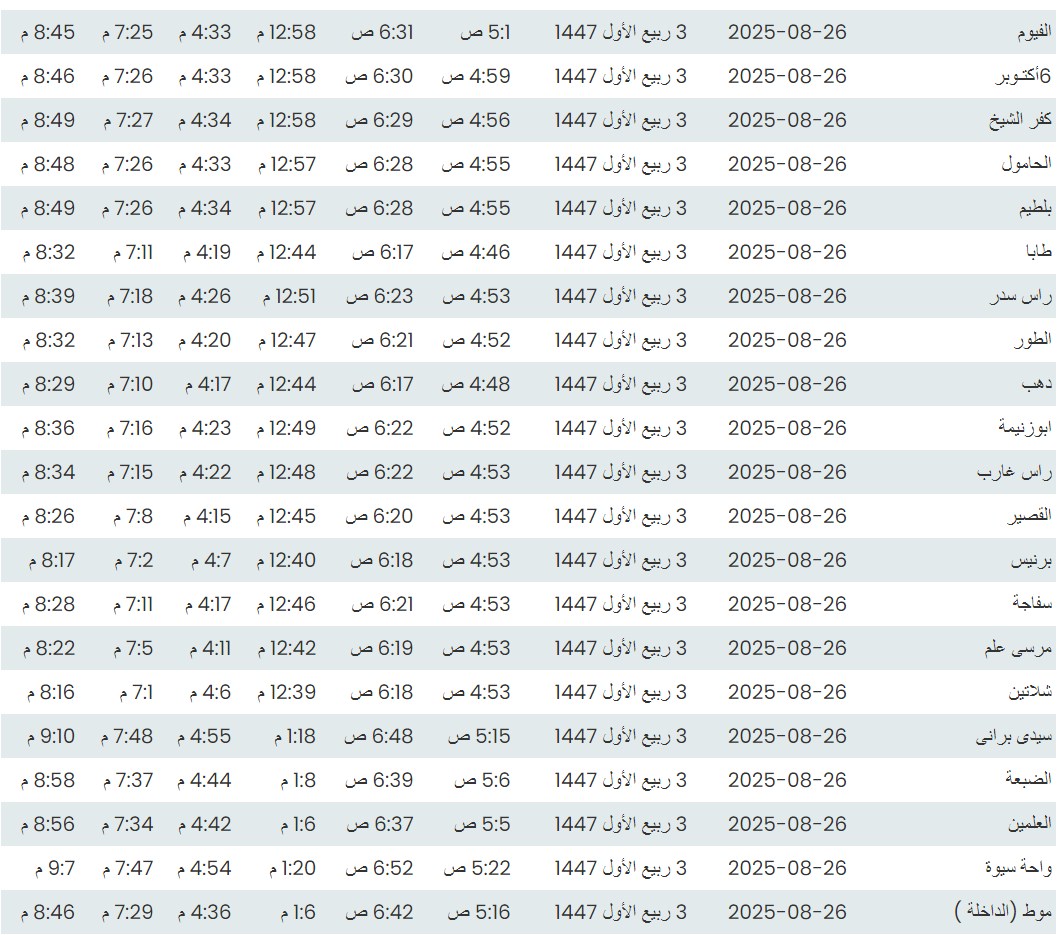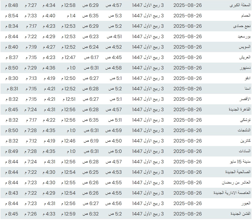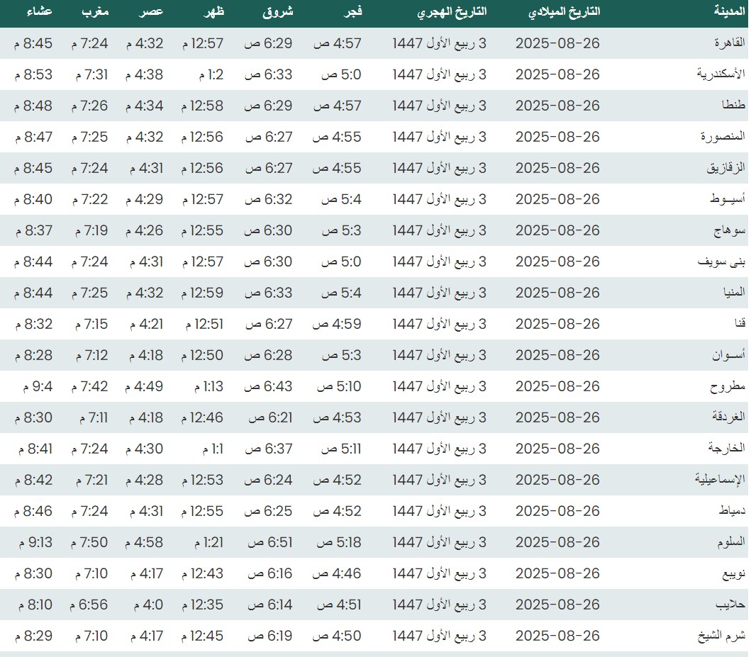 مواقيت الصلاة اليوم الثلاثاء 26 – 8 - 2025 في القاهرة والمحافظات