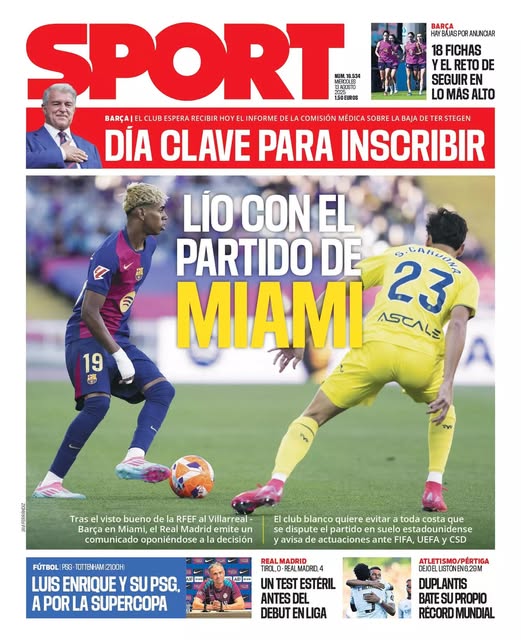 تصدرت أزمة اعتراض نادي ريال مدريد على إقامة مباراة برشلونة وفياريال بالدوري الإسباني في ميامي الأمريكية، أغلفة الصحف العالمية.