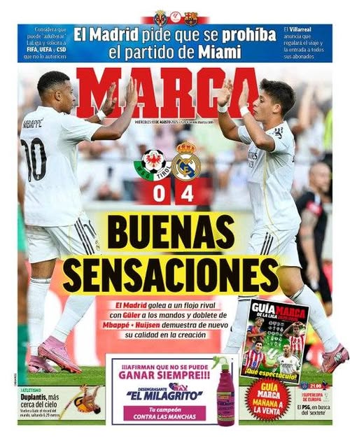 غلاف ماركا: ريال مدريد يُكتسح منافسًا ضعيفًا برباعية نظيفة بقيادة جولر، وثنائية مبابي، بينما يواصل هويسن تأكيد جودته في صناعة اللعب.