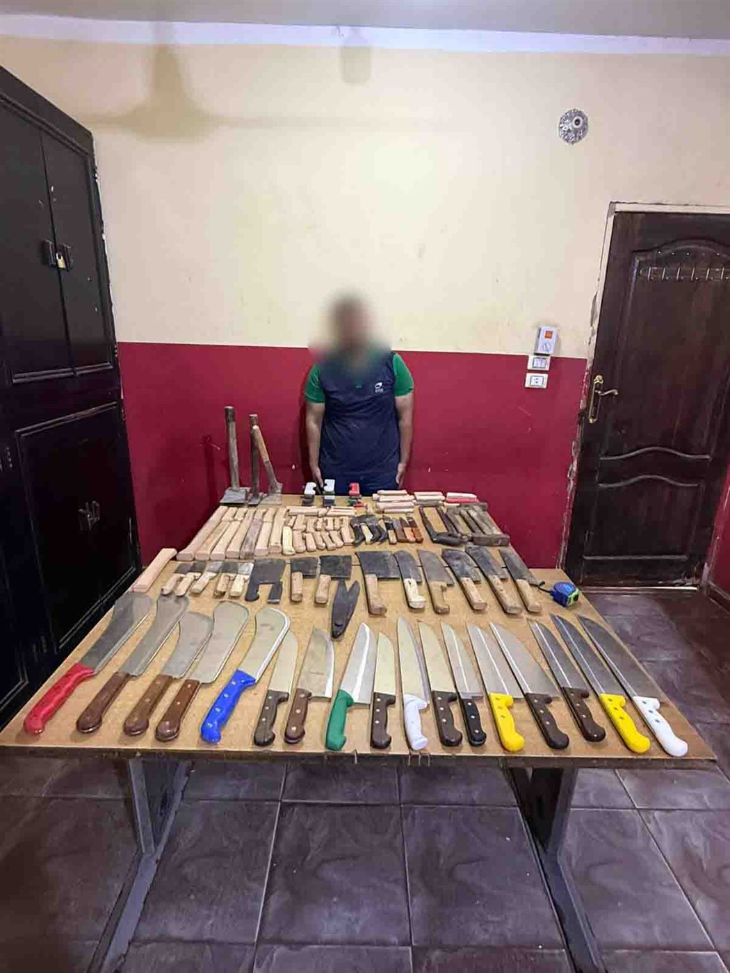 وعقب تقنين الإجراءات، تم ضبطه داخل الورشة وبحوزته 37 قطعة سلاح أبيض، بالإضافة إلى مجموعة من الأدوات والأجزاء المستخدمة في التصنيع. وبمواجهته، اعترف بقيامه بتصنيع الأسلحة البيضاء بدون ترخيص والإتجار بها.