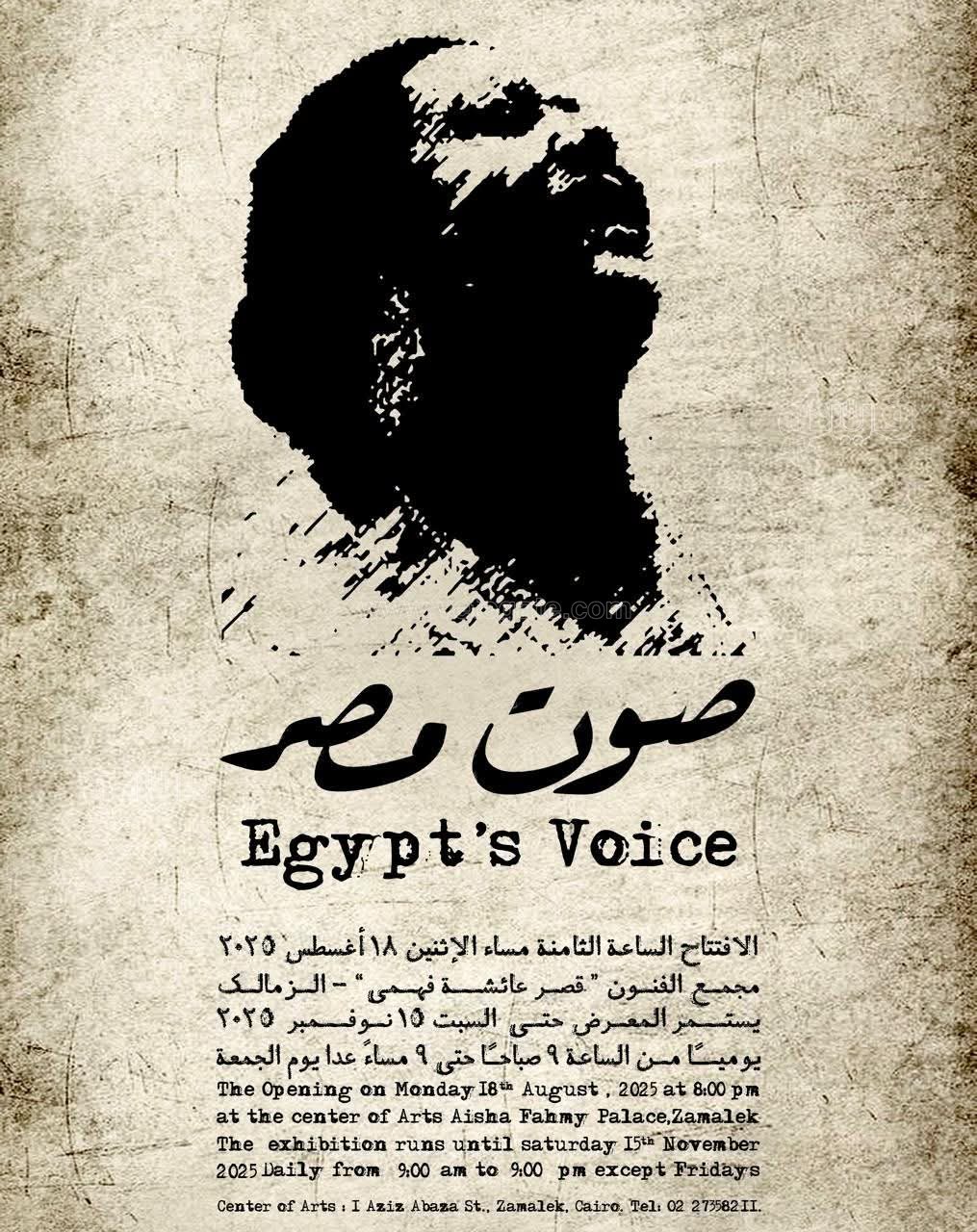 أعلن قطاع الفنون التشكيلية برئاسة الدكتور وليد قانوش عن استضافة مجمع الفنون بقصر عائشة فهمي لمعرض "صوت مصر" يوم الإثنين الموافق 18 أغسطس في تمام الساعة ٨ مساءً.