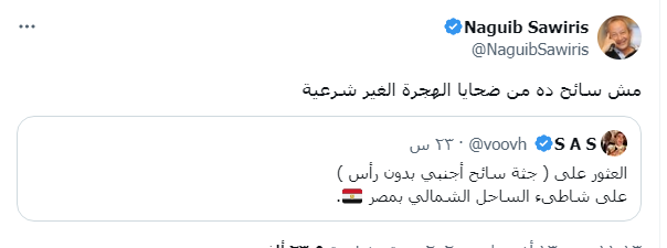 وقال نجيب ساويرس، في تغريدة عبر منصة "أكس"، في كشفه عن حقيقة الجثة بلا رأس التي وجدت بالساحل الشمالي: "مش سائح ده من ضحايا الهجرة غير الشرعية".