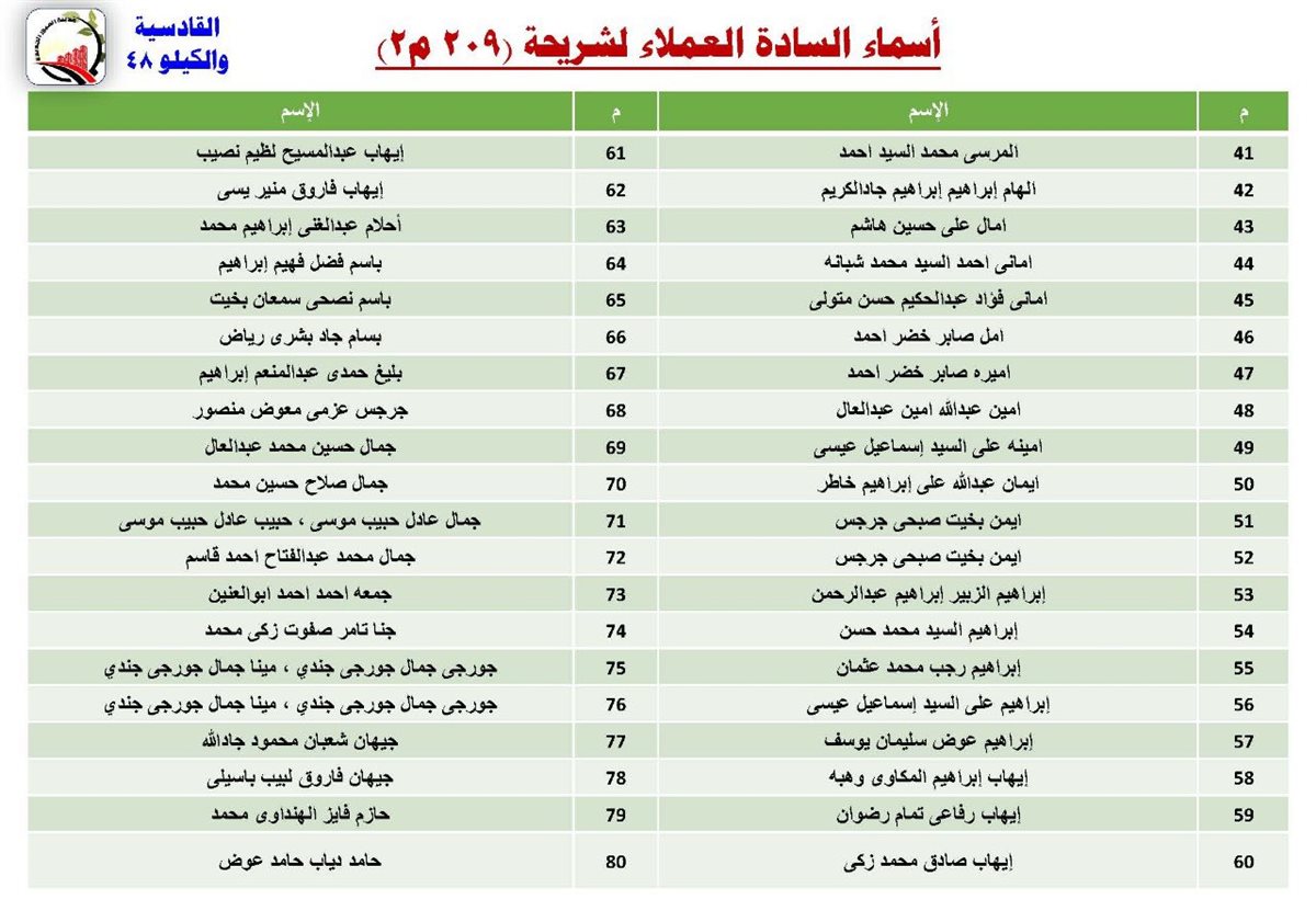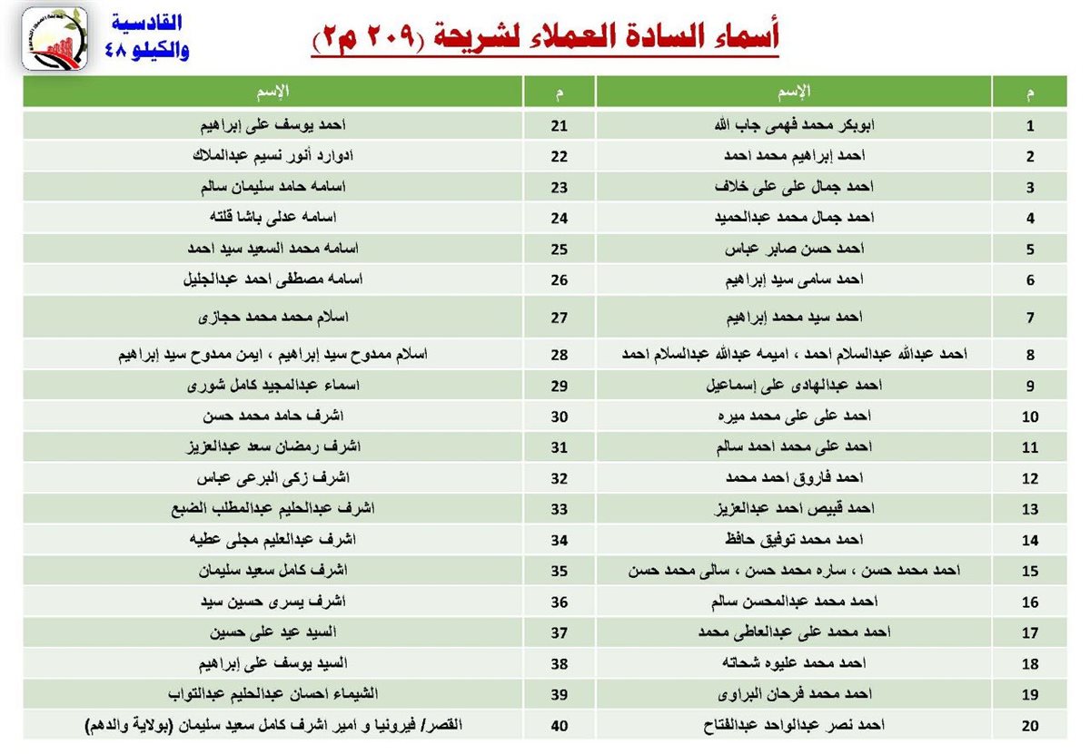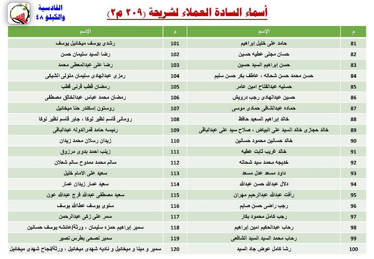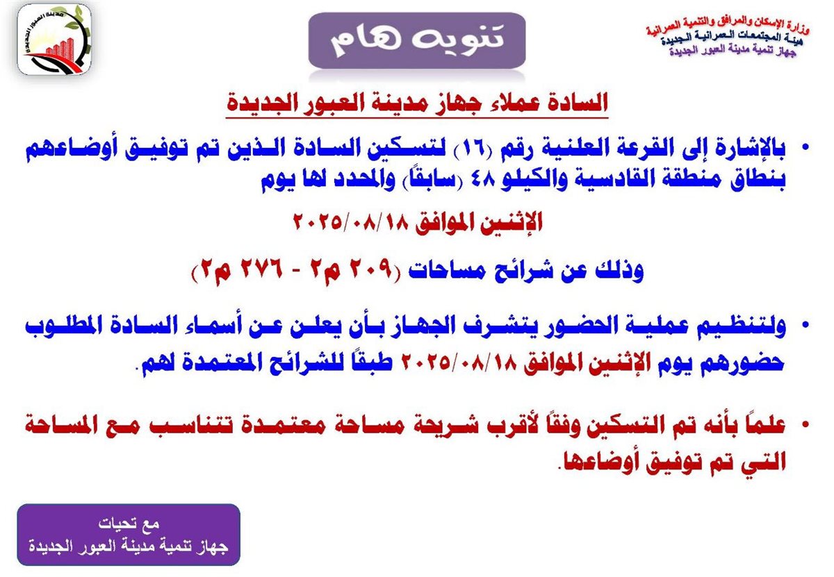 أعلن جهاز مدينة العبور الجديدة قائمة بأسماء حضور المواطنين للقرعة العلنية رقم 16 لتسكين أراضيهم التي تم توفيق أوضاعهم بنطاق منطقة القادسية والمحدد لها يوم الإثنين الموافق 18 أغسطس وذلك عن القطاع مساحات 209 – 276 مترًا مربعًا.