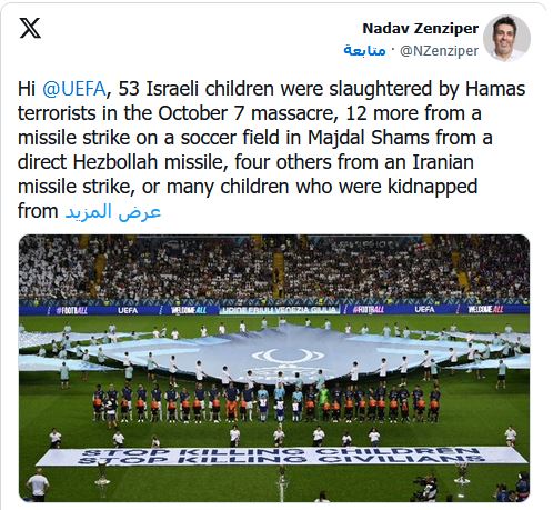 وقال زينزيبر في تغريدة على منصة "إكس" تعليقًا على اللافتة: "مرحبًا يويفا، 53 طفلًا إسرائيليًّا قُتلوا على يد حماس، و12 بقصف صاروخي من حزب الله، و4 بقصف إيراني، بالإضافة إلى العديد من الأطفال الذين اختُطفوا من أسرهم. أين كنتم حينها يا من تدّعون الأخلاق؟ أنتم منظمة منافقة، خائفة من محمد صلاح. عارٌ عليكم، فدماء أطفال إسرائيل ليست أقل شأنًا من دماء الأطفال في أي مكان آخر في العالم".