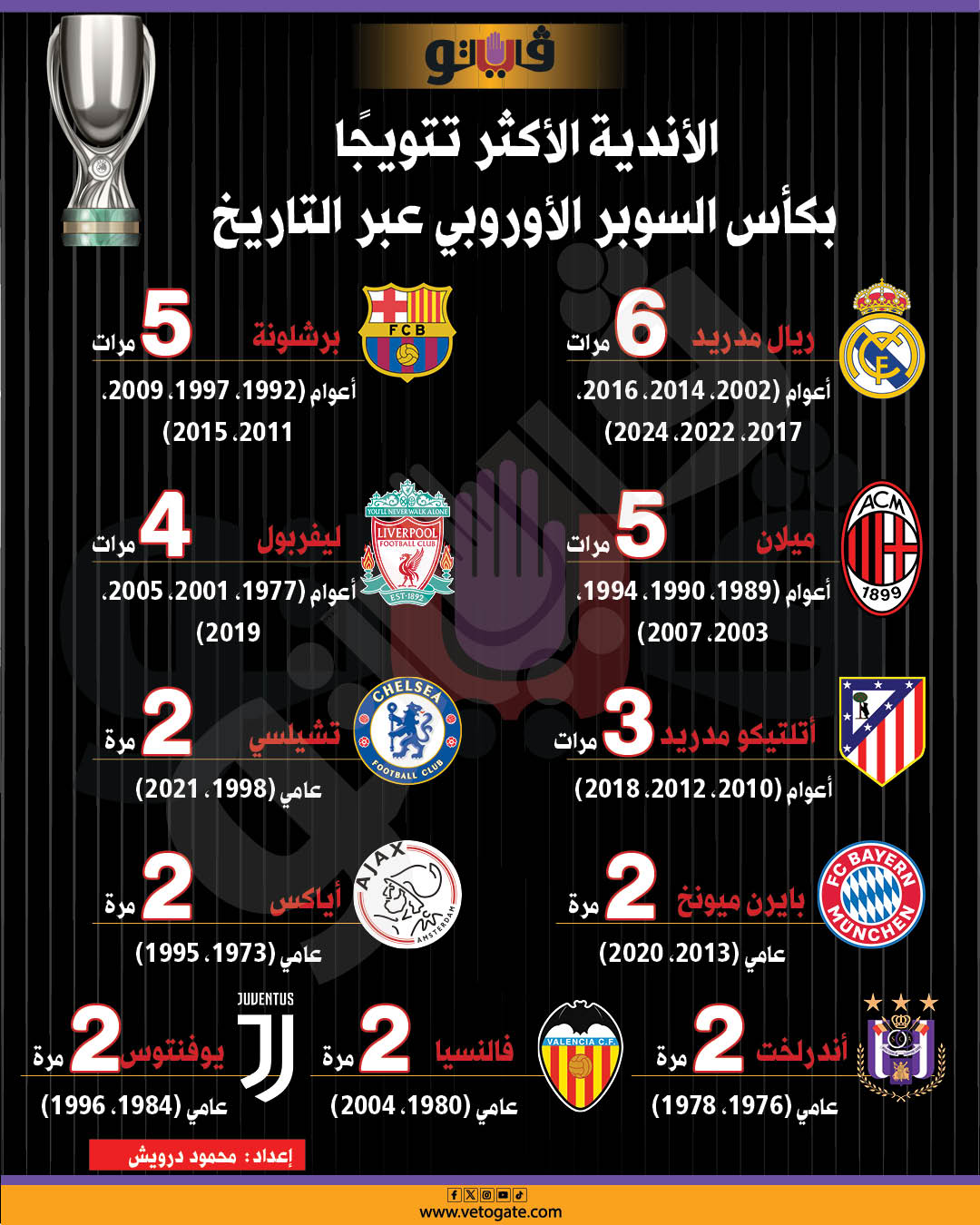 الأندية الأكثر تتويجًا بكأس السوبر الأوروبي عبر التاريخ (إنفوجراف)