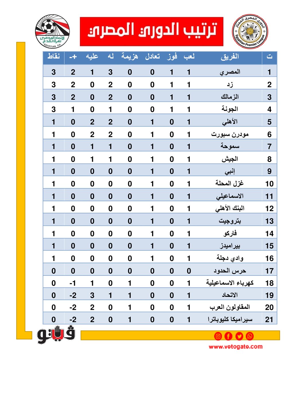 ترتيب الدوري المصري، يتصدر المصري البورسعيدي صدارة الدوري المصري الممتاز بفارق الأهداف عن الزمالك وزد والجونة قبل إنطلاق مباريات الجولة الثانية المقرر لها اليوم الخميس.