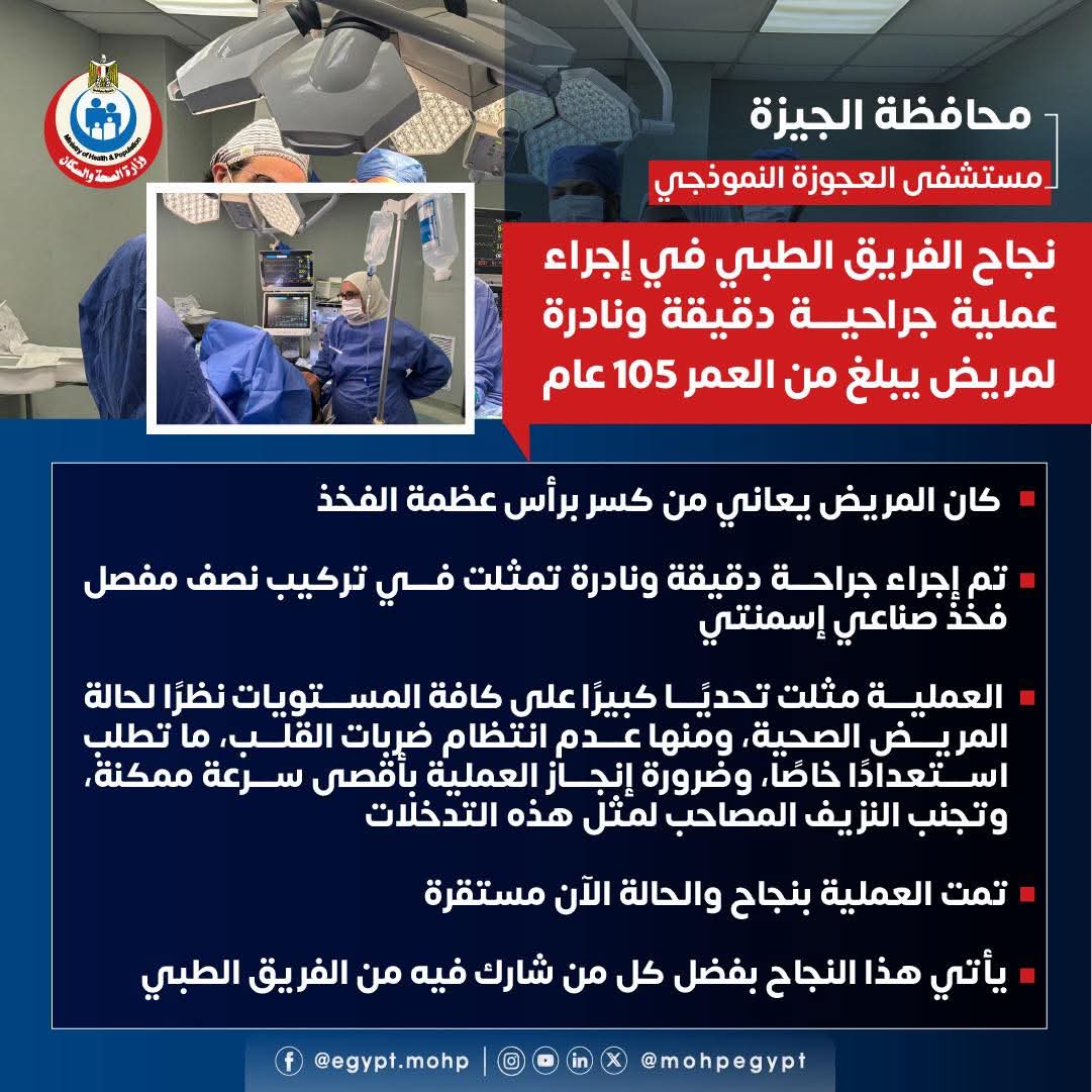 أعلنت وزارة الصحة عن نجاح الفريق الطبي بمستشفى العجوزة النموذجي، في إجراء عملية جراحية دقيقة ونادرة لمريض يبلغ من العمر 105 أعوام كان يعاني من كسر برأس عظمة الفخذ.