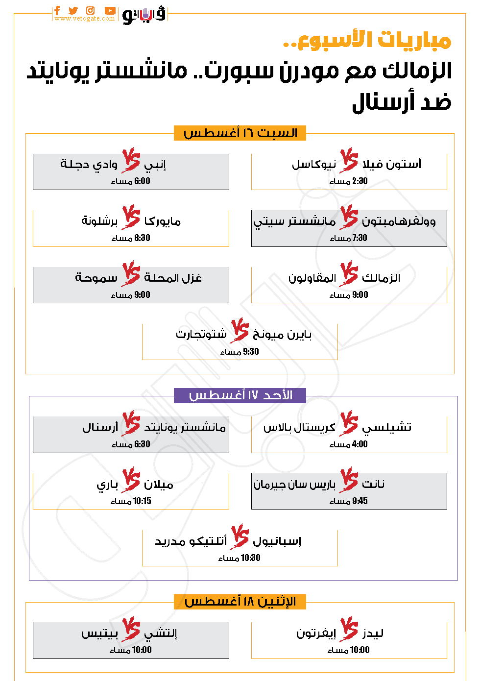 مباريات الأسبوع، الزمالك مع مودرن سبورت.. مانشستر يونايتد ضد آرسنال (إنفوجراف)