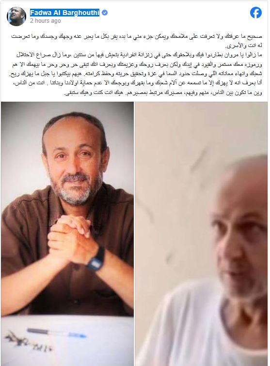وأضافت: "ما زالوا يا مروان يطاردون فيك ويلاحقونك حتى في زنزانة انفرادية بتعيش فيها من سنتين، وما زال صراع الاحتلال ورموزه معك مستمر والقيود في إيدك، ولكن بعرف روحك وعزيمتك".