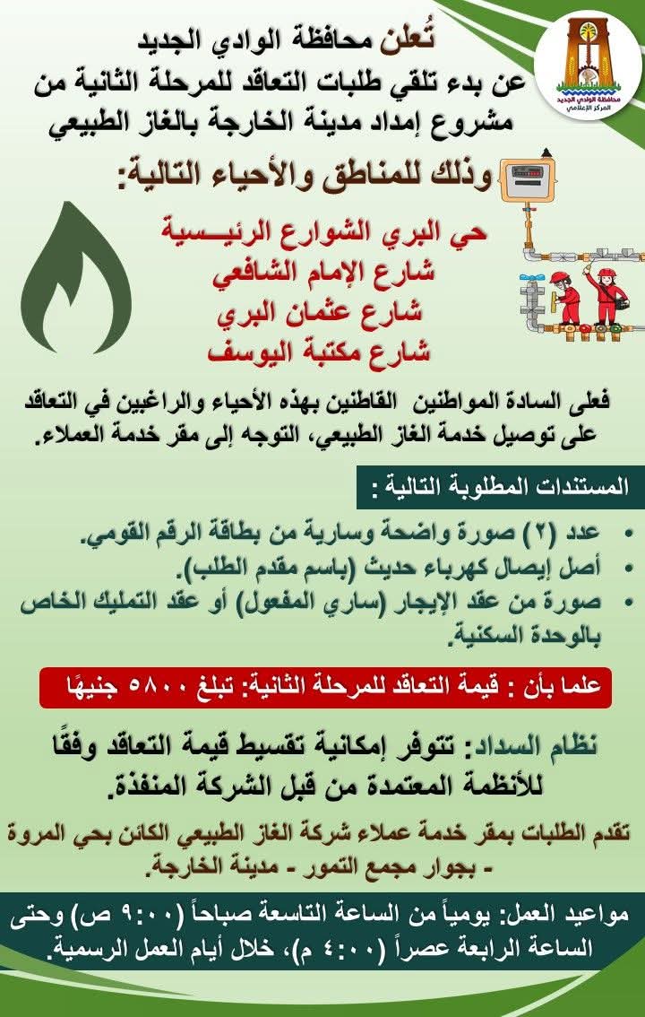 أوضح المحافظ، أنه على المواطنين المقيمين بهذه الأحياء والراغبين في التعاقد لتوصيل خدمة الغاز الطبيعي، التوجه إلى مقر خدمة العملاء لشركة الغاز الطبيعي بحي المروة بمدينة الخارجة بجوار مجمع التمور، ومعهم المستندات التالية،