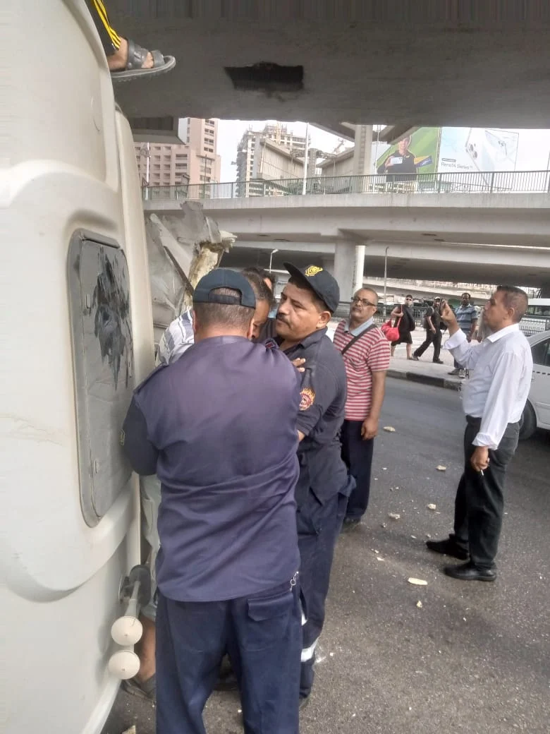 وكانت غرفة عمليات الحماية المدنية بالقاهرة، تلقت بلاغًا يفيد بانقلاب سيارة نقل ثقيل واحتجاز شخصين داخلها.