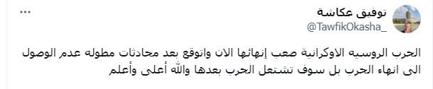 وعن الحرب الروسية الأوكرانية، قال توفيق عكاشة: “الحرب الروسية الأوكرانية صعب إنهائها الآن، وأتوقع بعد محادثات مطولة عدم الوصول إلى إنهاء الحرب بل سوف تشتعل الحرب بعدها والله أعلى وأعلم”.