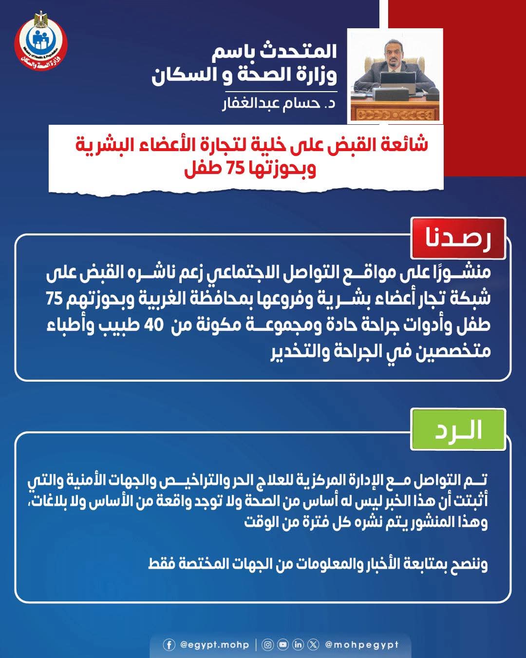أكد الدكتور حسام عبد الغفار، المتحدث الرسمي باسم وزارة الصحة والسكان، أنه لا صحة لما تم تداوله عبر مواقع التواصل الاجتماعي بشأن القبض على شبكة لتجارة الأعضاء البشرية بمحافظة الغربية وبحوزتها 75 طفلا، وأدوات جراحية حادة، وبمشاركة 40 طبيبا متخصصا في الجراحة والتخدير.