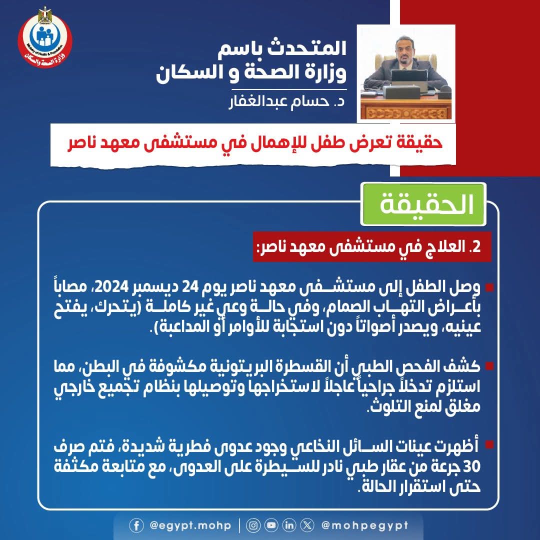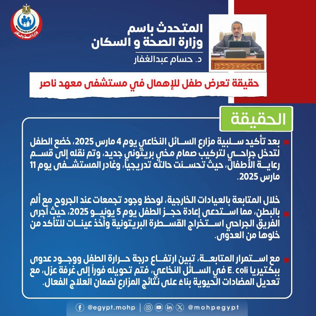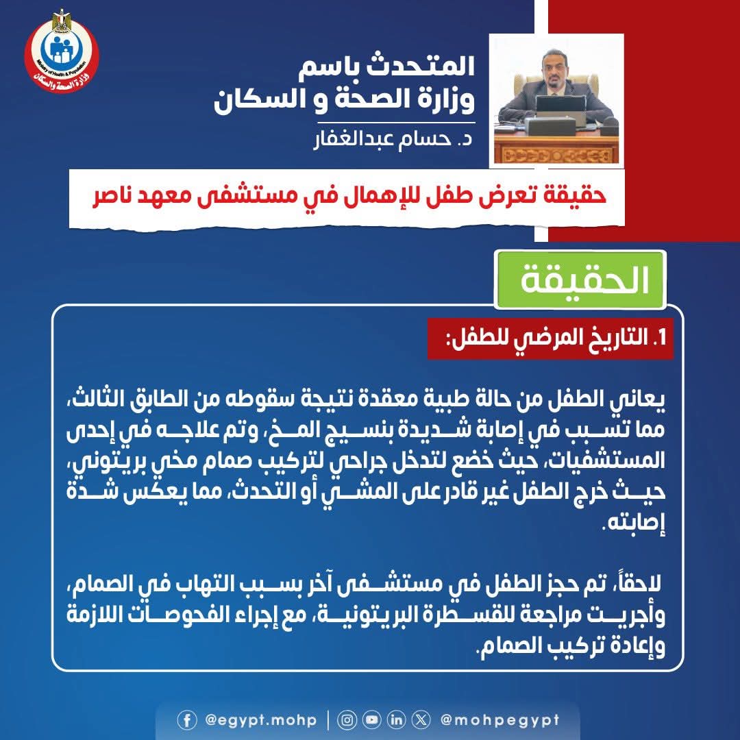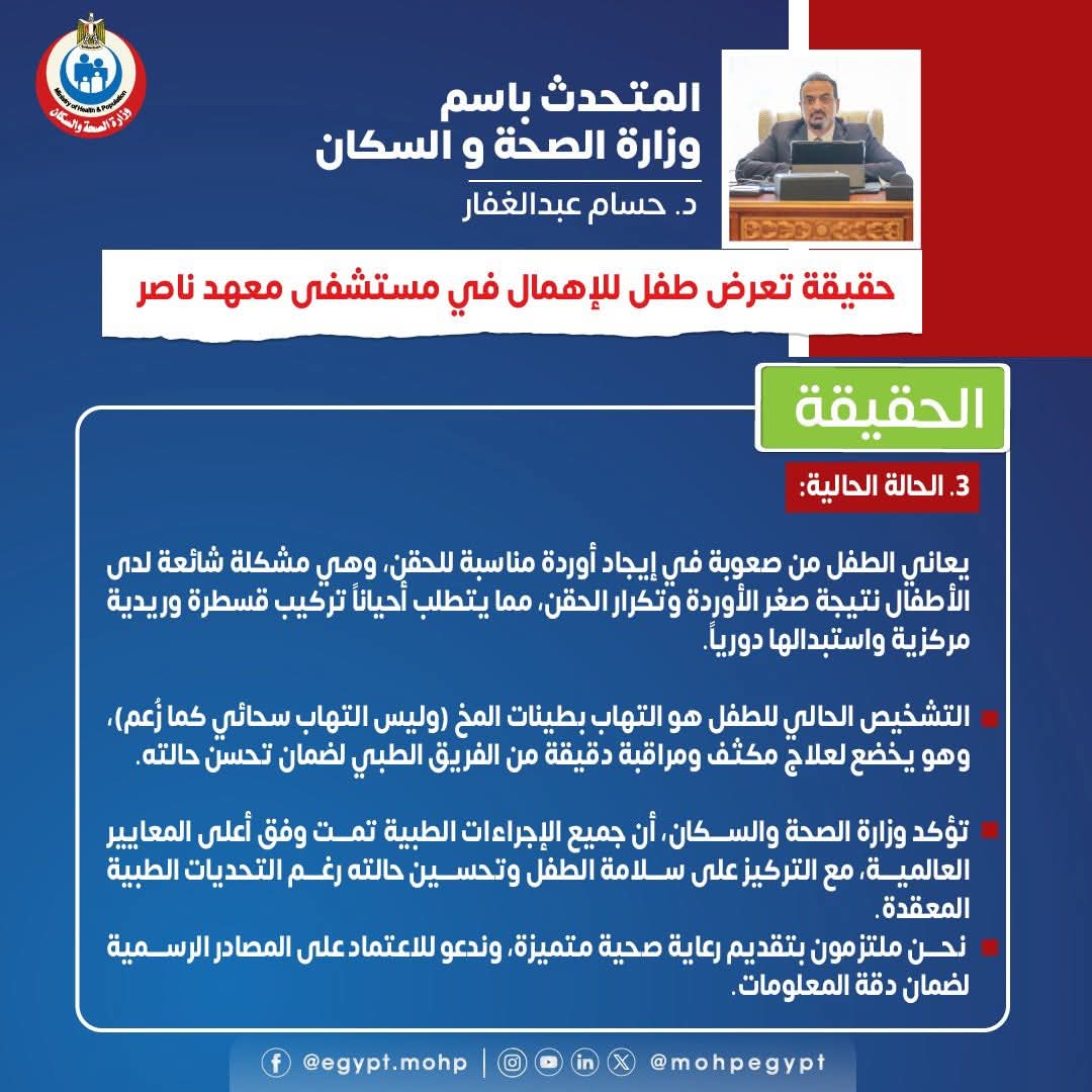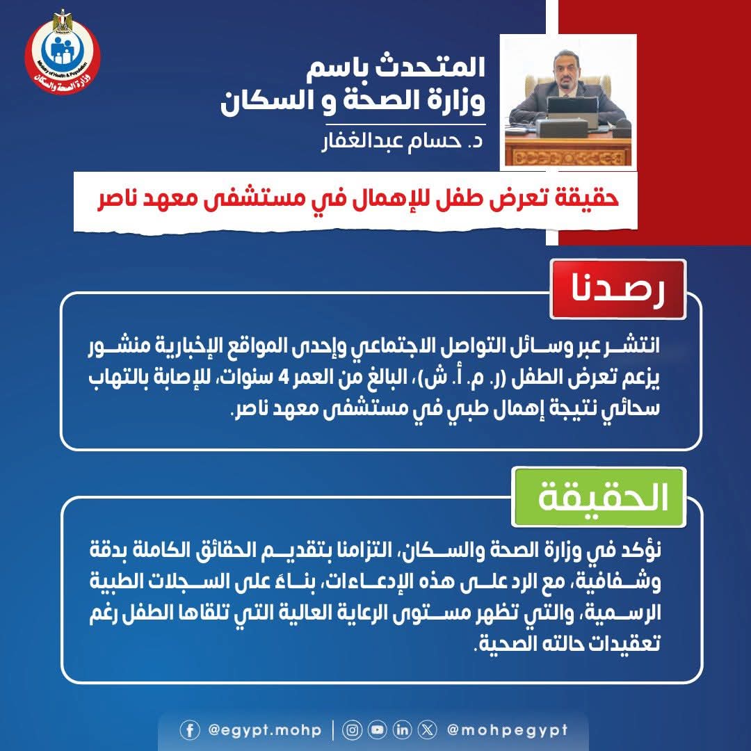 نفت وزارة الصحة والسكان ما تم تداوله على بعض مواقع التواصل الاجتماعي بشأن تعرض طفل يبلغ من العمر 4 سنوات للإهمال الطبي داخل مستشفى معهد ناصر.