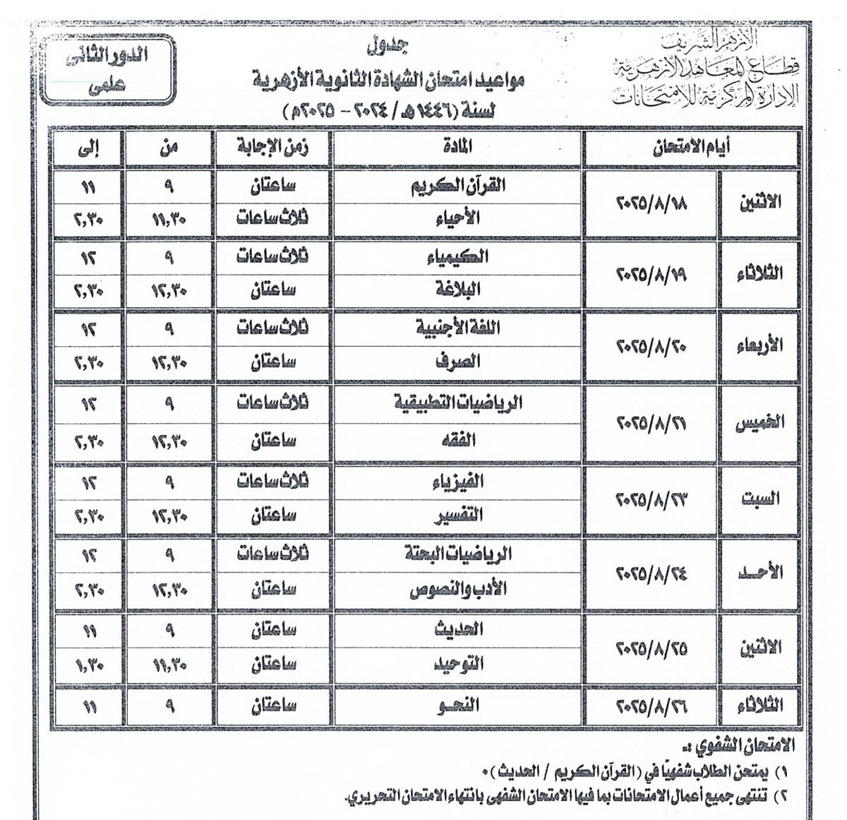 جدول امتحانات الثانوية الأزهرية الدور الثاني 2025 للشعبة العلمية