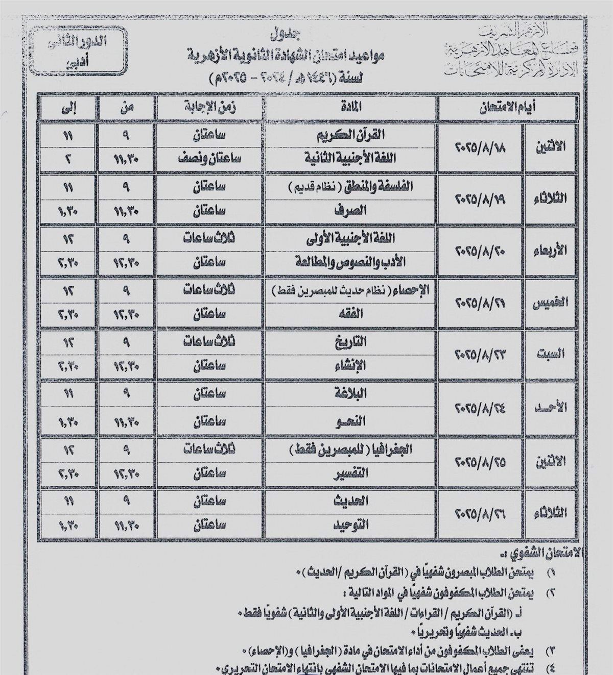 قبل انطلاقها غدًا، جدول امتحانات الدور الثاني للشهادة الثانوية الأزهرية (صور)