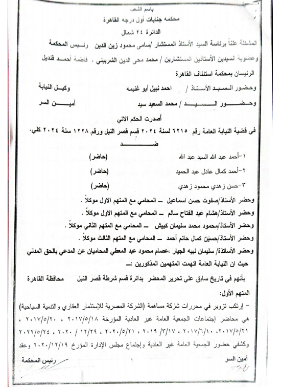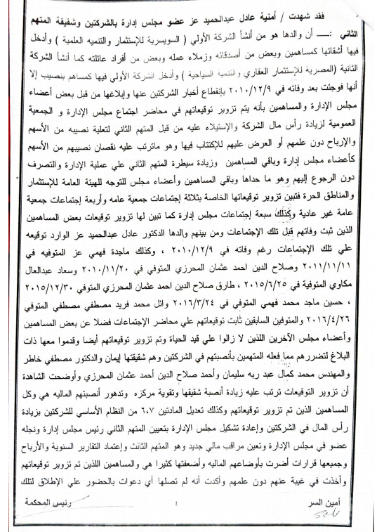 وأجرت النيابة العامة تحقيقات موسعة واستمعت لشهادة عدد كبير من الشهود، وخلصت إلى المتهم الأول ارتكب جريمة التزوير فى محررات شركة مساهمة هى (الشركة المصرية للاستثمار العقاري والتنمية السياحية)، هذه المحررات هى محاضر اجتماعات الجمعية العامة غير العادية للشركة، التى عقدت فى غضون الفترة من 2017 حتى 2022، وكشفى حضور الجمعية العامة غير العادية، واجتماع مجلس الإدارة فى 19 ديسمبر 2020، وعقد تعديل النظام الأساسي للشركة المؤرخ فى 19 ديسمبر 2020، وذلك بأن وضع توقيعات مزورة ونسبها للمتهم الثاني، وكذلك توقيعات الوزير الراحل عادل عبد الحميد عز، وزير البحث العلمي الأسبق، وابنتيه أمنية وإيمان عادل عز، وهما من المساهمين فى الشركة