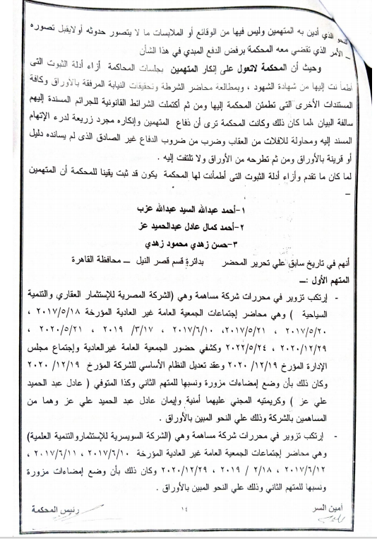 وتضمنت أوراق القضية كذلك أن المتهم الأول المدعو أحمد عبد الله، ارتكب جريمة تزوير فى محررات شركة مساهمة أخرى هى (الشركة السويسرية للاستثمار والتنمية العلمية)، وهي محاضر اجتماعات الجمعية العامة غير العادية التى عقدت بتواريخ 10، و11، و12 يونيو 2017.. و18 فبراير 2019، و29 ديسمبر 2020، وذلك من خلال توقيع نسبها زورا للمتهم الثاني