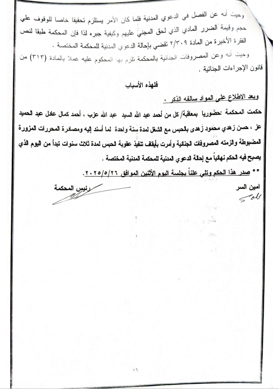 فى واحدة من أكثر القضايا غرابة وإثارة، قضت الدائرة (24) بمحكمة جنايات قصر النيل، برئاسة المستشار سامي محمود زين الدين، وعضوية المستشارين: محمد محيي الدين الشربيني، وفاطمة أحمد قنديل، وأمانة سر محمد السعيد، بمعاقبة 3 أشخاص بينهم نجل وزير سابق، بالحبس لمدة سنة مع الشغل، بتهمة الاشتراك فى تزوير محررات ومستندات خاصة بشركتين استثماريتين، واستخدام تلك المحررات فى تحقيق مصلحة خاصة تمثلت فى زيادة حصة أحد المتهمين فى أسهم الشركتين.. وأمرت المحكمة بإيقاف التنفيذ لمدة 3 سنوات من تاريخ اليوم الذى يصبح فيه الحكم نهائيا.