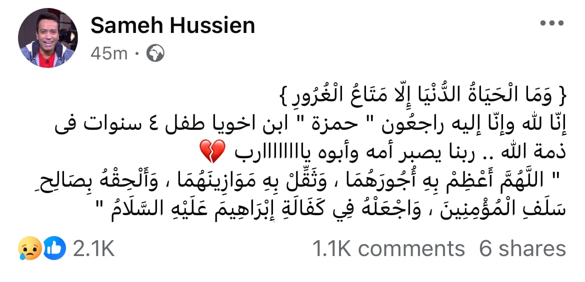 وكتب سامح: "{وَمَا الْحَيَاةُ الدُّنْيَا إِلَّا مَتَاعُ الْغُرُورِ.. إنّا لله وإنّا إليه راجعُون " حمزة ابن اخويا طفل ٤ سنوات في ذمة الله.. ربنا يصبر أمه وأبوه يا رب”.