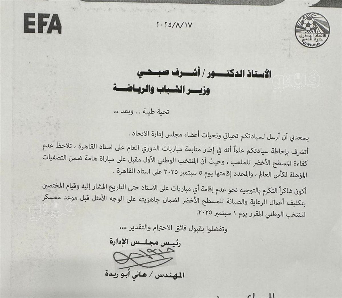 وأضاف أبو ريدة في خطابه لوزير الرياضة: “وحيث أن المنتخب مقبل على مباراة هامة أمام إثيوبيا في تصفيات كأس العالم يوم 5 سبتمبر المقبل، أكون شاكرا بالتوجيه نحو عدم إقامة أي مباريات على الاستاد وقيام المختصين بتكثيف أعمال الرعاية والصيانة للمسطح الأخضر لضمان ظهوره بالشكل الأمثل قبل معسكر المنتخب الذي ينطلق يوم 1 سبتمبر”.