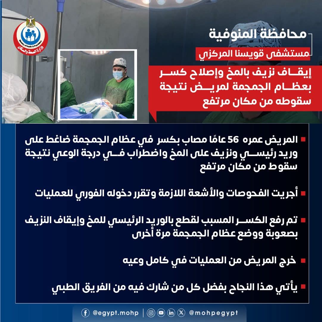 أعلنت وزارة الصحة نجاح الفريق الطبي بمستشفى قويسنا المركزي بمحافظة المنوفية، في إنقاذ حياة مريض يبلغ من العمر 56 عامًا، بعدما تعرض لسقوط من مكان مرتفع، نتج عنه كسر في عظام الجمجمة ضاغط على وريد رئيسي، ونزيف بالمخ، صاحبَه اضطراب في درجة الوعي.