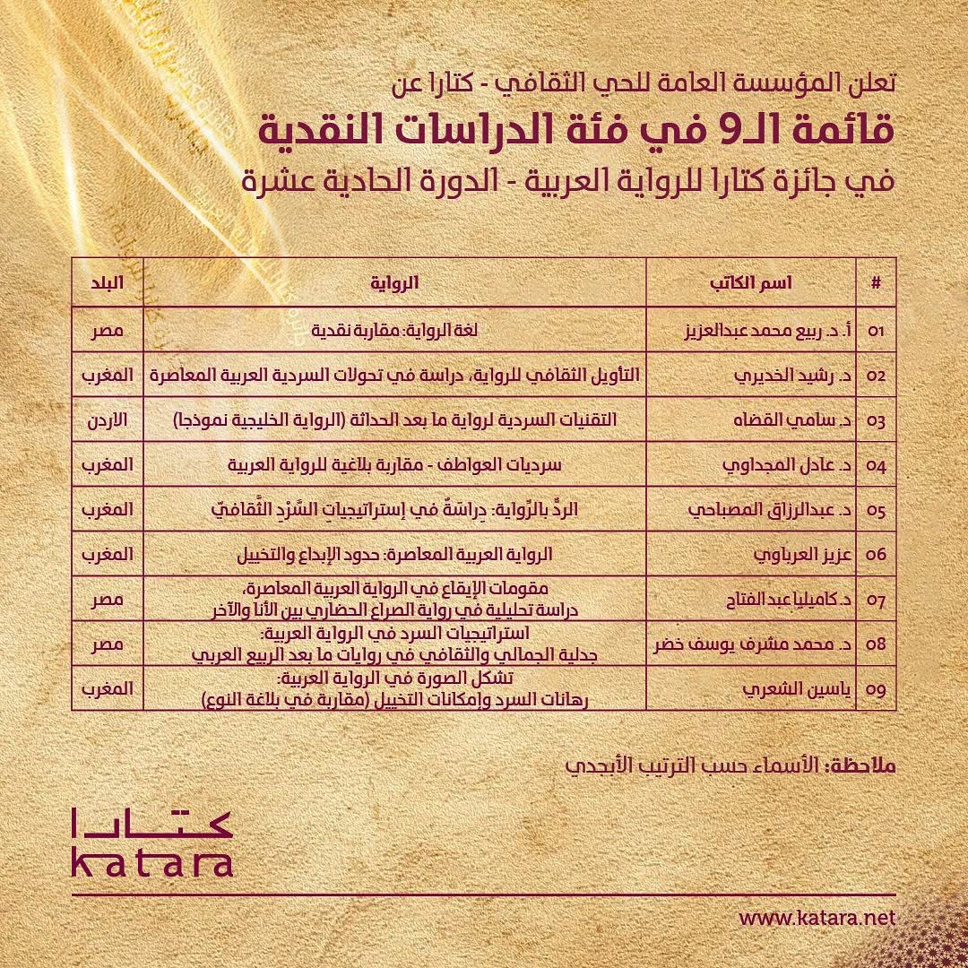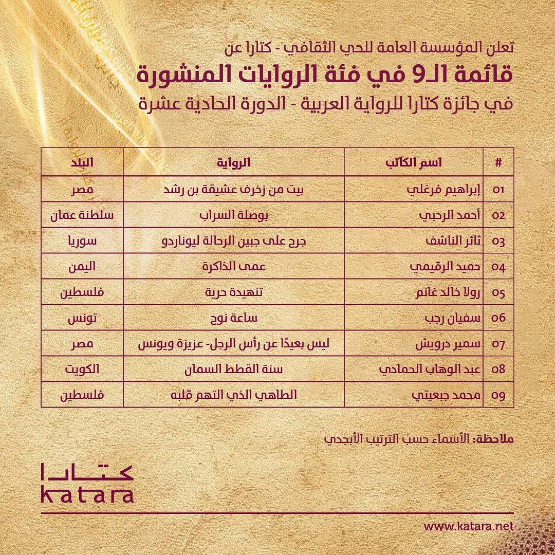 أعلنت المؤسسة العامة للحي الثقافي “كتارا” عن القوائم القصيرة لفروع جائزة كتارا للرواية العربية في دورتها الحادية عشرة، حيث جاءت القوائم كالتالي: