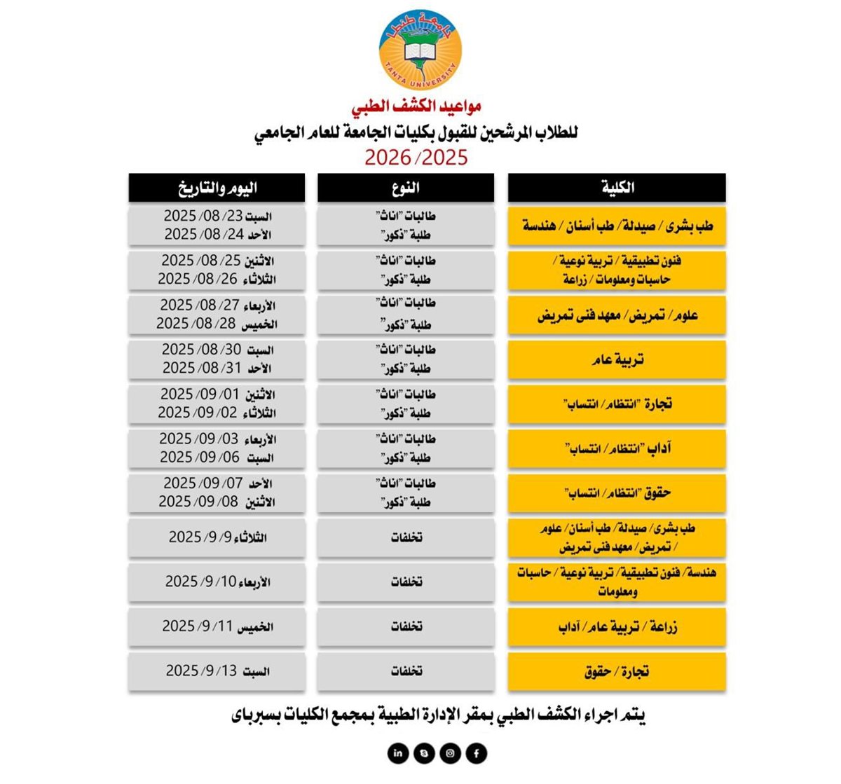 أعلن الدكتور محمد حسين رئيس جامعة طنطا عن بدء إجراء الكشف الطبي للطلاب الجدد المرشحين من قبل مكتب التنسيق الرئيسي للالتحاق بكليات الجامعة والمعهد الفني للتمريض للعام الجامعي 2025/2026 اعتبارًا من يوم السبت الموافق 23 أغسطس المقبل وحتى يوم السبت الموافق 13 سبتمبر 2025،