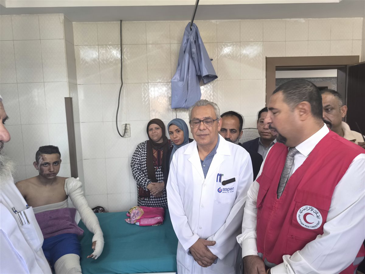 كما قام الوفد بزيارة لمصابي قسم الحروق وتقديم الدعم النفسي والعيني لهم مشيدين بالخدمة الطبية المقدمة داخل المستشفى.