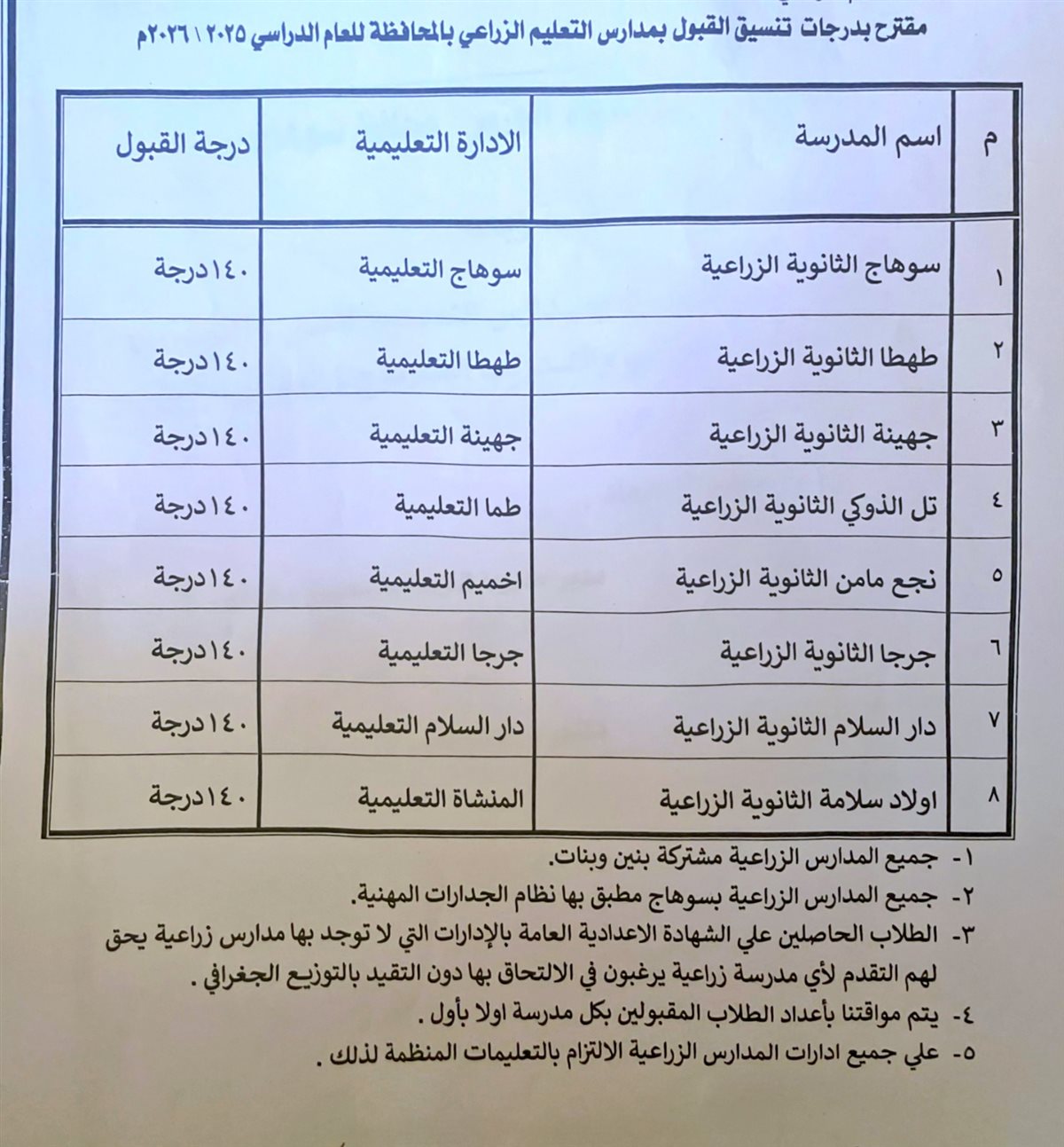 وأوضح الدكتور محمد السيد وكيل وزارة التربية والتعليم بسوهاج أنه تم تحديد 140 درجة للقبول بالمرحلة الثانية بمدارس " سوهاج الثانوية الزراعية، طهطا الثانوية الزراعية، جهينة الثانوية الزراعية، تل الزوكي الثانوية الزراعية بطما، نجع مامن الثانوية الزراعية بأخميم، جرجا الثانوية الزراعية، دار السلام الثانوية الزراعية، أولاد سلامة الثانوية الزراعية بالمنشأة".