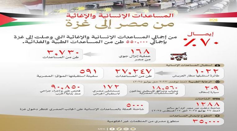 وبحسب البيان، فإن مصر أرسلت 70% من إجمالي المساعدات الإنسانية والإغاثية التي وصلت إلى غزة، بإجمالي 550 ألف طن من المساعدات الطبية والغذائية.